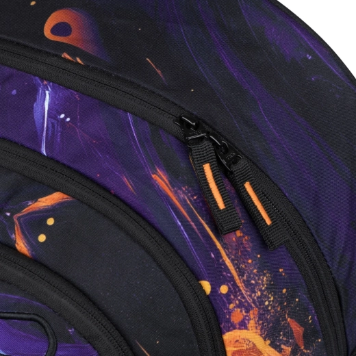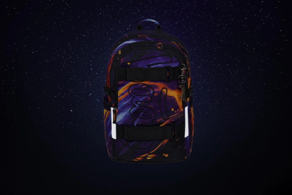 Notranjost sestavljajo trije ločeno zapirljivi predeli s praktičnim organizatorjem ter oblazinjen žep za 15" prenosnik ali tablico. Zanesljive zadrge YKK omogočajo gladko odpiranje, medtem ko trakovi na sprednji strani nahrbtnika omogočajo pritrditev rolke ali jakne. Ne manjkajo niti stranski žepi iz trpežnega materiala, usklajeni z dizajnom, idealni za steklenico. Priložen je tudi stilski obesek, nahrbtnik pa lahko uskladite s peresnico ali vrečko v istem motivu.