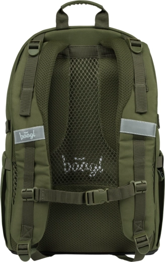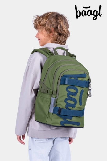 Praktičen šolski set BAAGL v slogu Olive združuje lahko in odporno zasnovo, ergonomski nahrbtnik s trakovi za skateboard, prostorno peresnico in zložljivo športno torbo. Idealno za učence od 3. razreda naprej – iz recikliranih, vodoodpornih materialov s certifikatom GRS in z varnimi odsevnimi elementi.