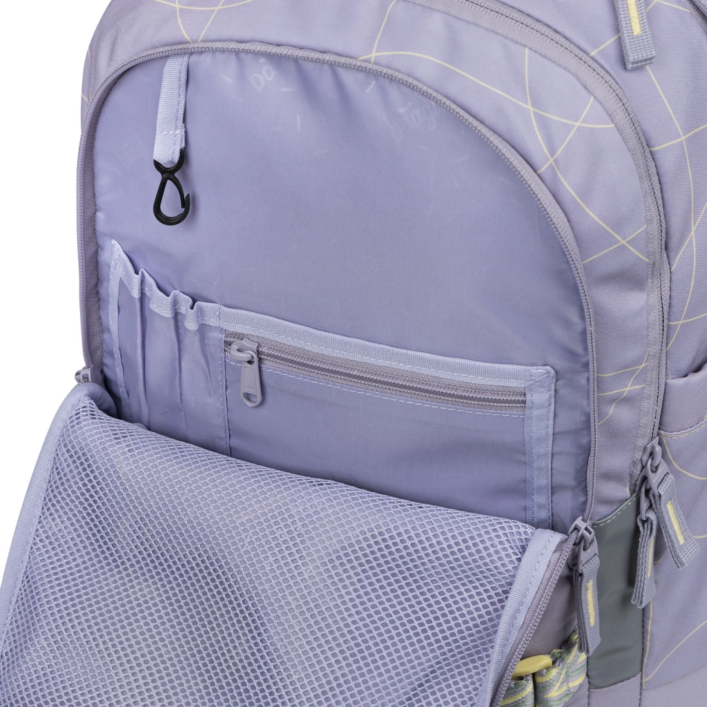 Trokamerno razporeditev s preglednim organizatorjem, žametnim žepom za prenosnik ali tablico ter praktičnimi dvosmernimi zadrgami YKK zagotavlja hiter dostop in varno shranjevanje šolskih potrebščin in elektronike. Stranska žepa iz trpežnega materiala sprejmeta steklenico za pijačo in sta usklajena z dizajnom nahrbtnika. Trpežen, vodoodporen material s certifikatom GRS ter izraziti odsevni elementi povečujejo varnost in prijaznost do narave.