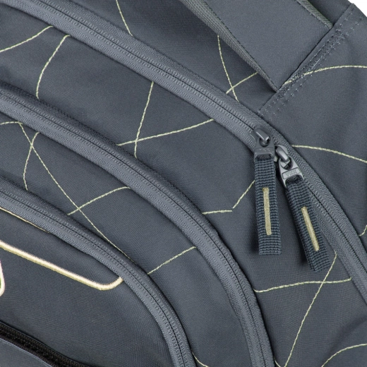 Tridelna razporeditev, žametni žep za prenosnik ali tablico in dvopotne zadrge YKK za hiter dostop in varno shranjevanje šolskih potrebščin.