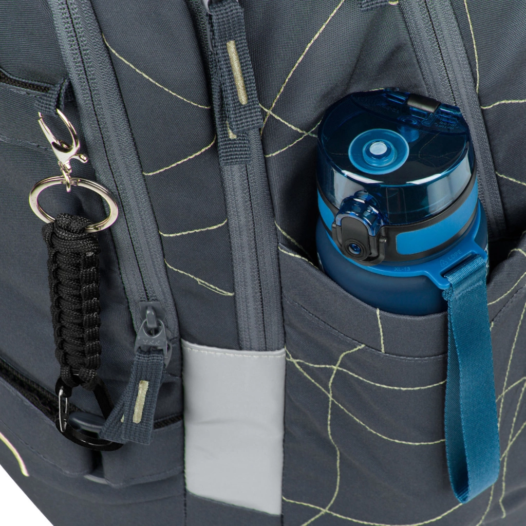 Tridelna zasnova z dvopotnimi zadrgami YKK nudi odličen pregled in hiter dostop. V notranjosti najdete žametni žep za prenosnik ali tablico, stranska žepa za steklenico in ojačan ročaj z nosilnostjo do 8 kg. Peresnica ETUE Wave ponuja prostorno komoro, dvojni preklopni del, notranji žep in okence za urnik. Vrečka Wave je iz trpežnega pralnega materiala z zatezanjem na vrvice, ki omogočajo nošenje na hrbtu.
