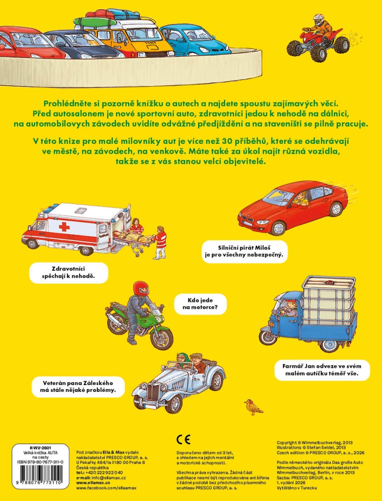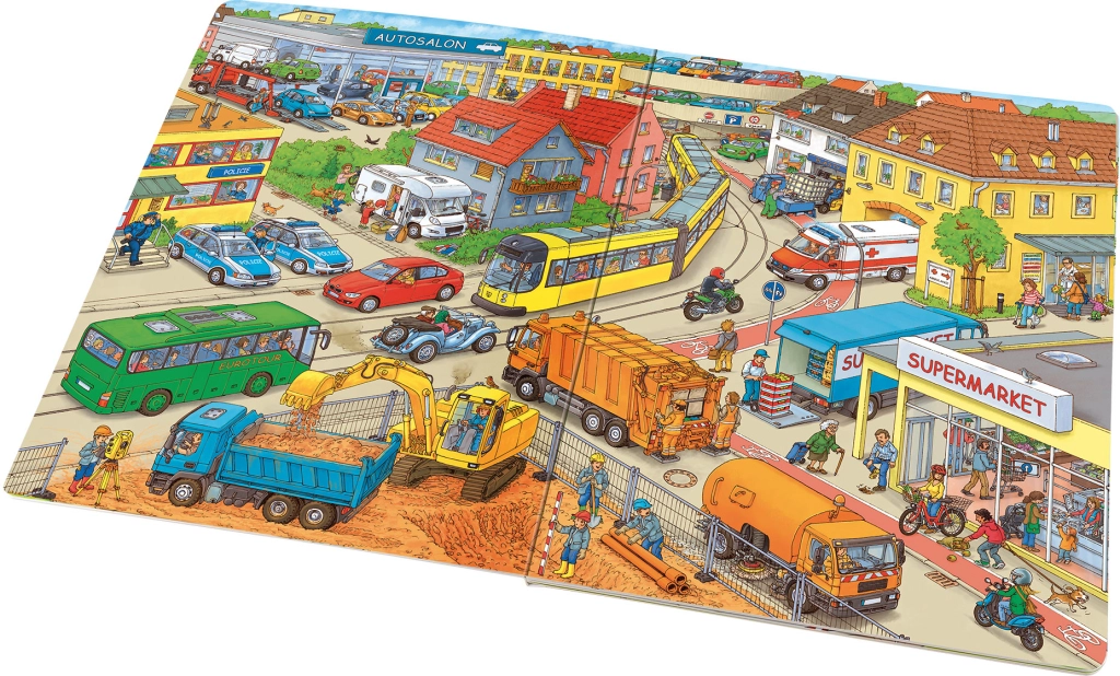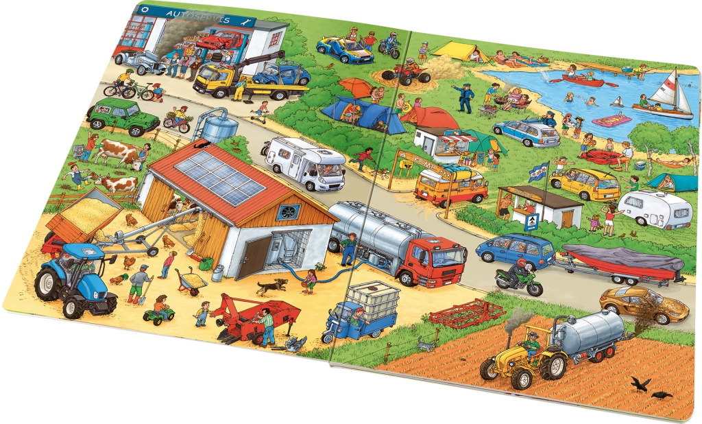 Ta bogato ilustrirana knjiga bo navdušila male ljubitelje motorjev in strojev. Na vsaki strani bodo otroci našli številne prizore iz resničnega sveta – od prometnih cest prek gradbišč do dirkalnih stez. Ilustracije so polne drobnih podrobnosti, ki držijo pozornost in spodbujajo opazovanje ter pripovedovanje.