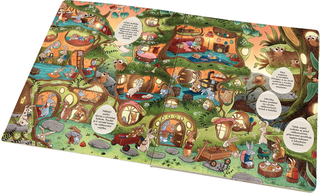 Ta čudovito ilustrirana knjiga otrokom prinaša pomladno vzdušje in na zabaven način približa običaje velike noči. Zajčki imajo polne tačke dela – barvajo jajčka, pripravljajo presenečenja in darilca. Otroci lahko pokukajo v njihov skrivnostni svet ter se ob tem na igriv način urijo v branju in zbranosti.