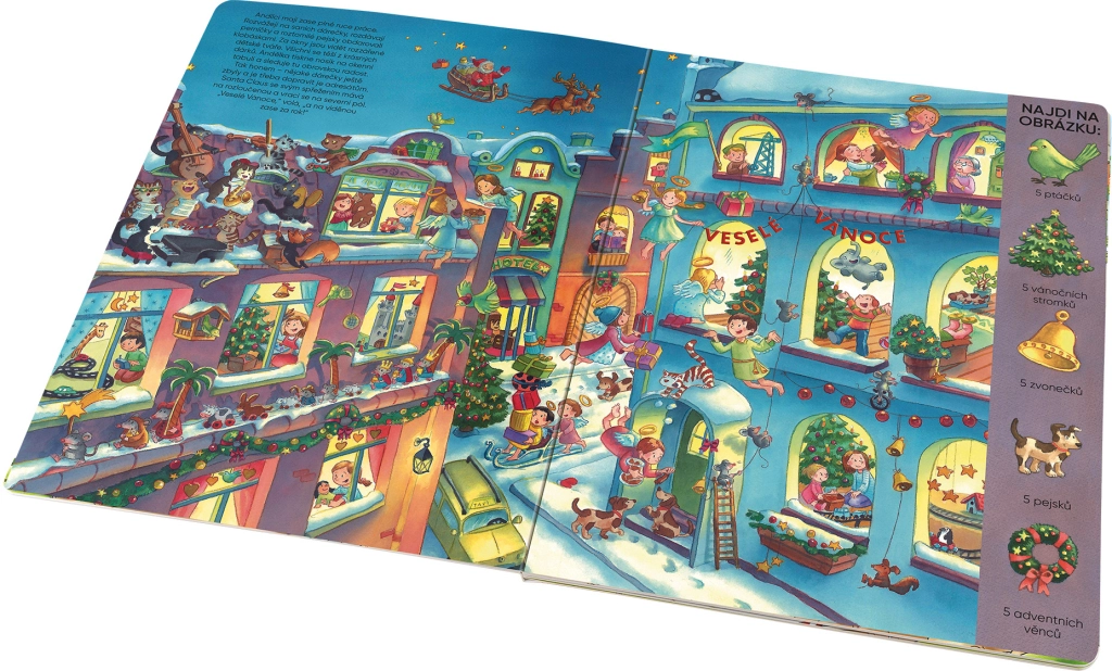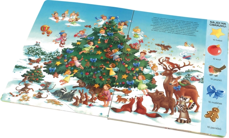 Ta velika slikanica otrokom prinaša božično vzdušje naravnost domov. Skupaj s starši lahko odkrivajo bogato ilustrirane prizore, pripovedujejo lastne zgodbe in pri tem razvijajo besedni zaklad, pozornost in vizualno zaznavanje. Vsaka razgrnitev ponuja izzive za iskanje predmetov po navodilih, kar knjigo naredi odlično izbiro za skupne zimske večere.