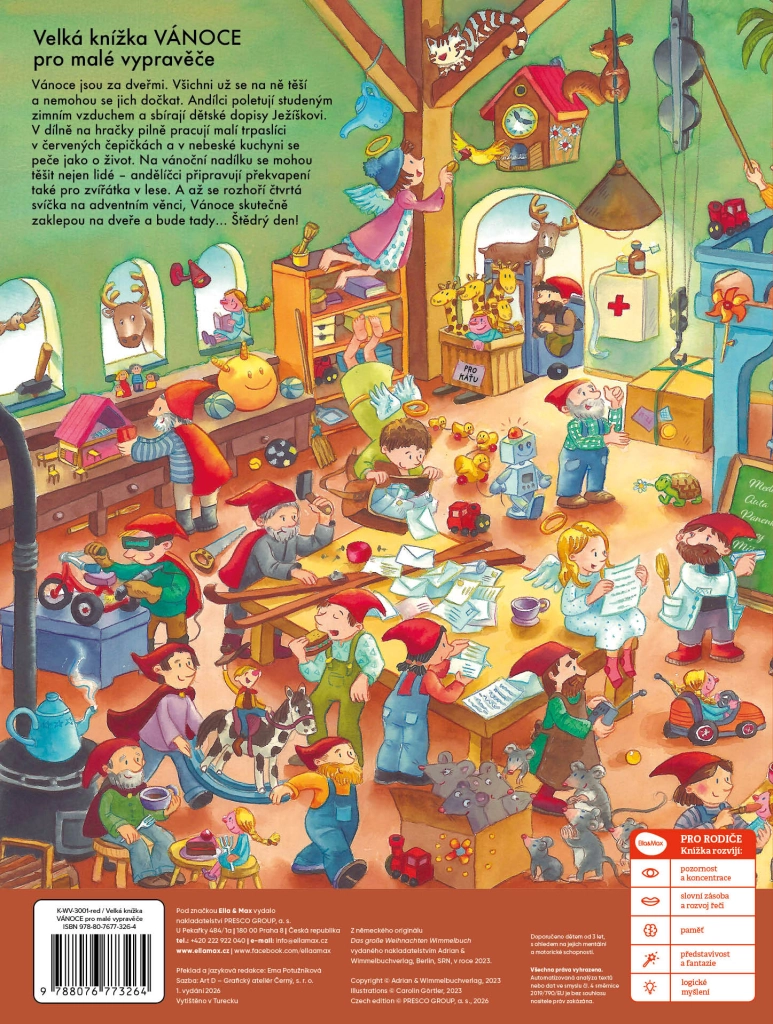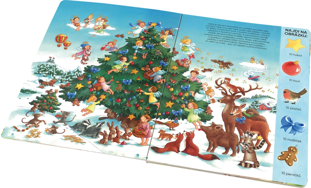Obiščite palčkovo delavnico, opazujte angelčke, ki zbirajo pisma Jezusu, in pokukajte v nebeško kuhinjo, kjer se pridno peče. Ne pozabimo niti na živali v gozdu – tudi zanje je pripravljeno presenečenje. Zaradi velikega formata in jasnih navodil je knjiga idealna za predšolske otroke in mlajše šolarje.