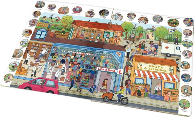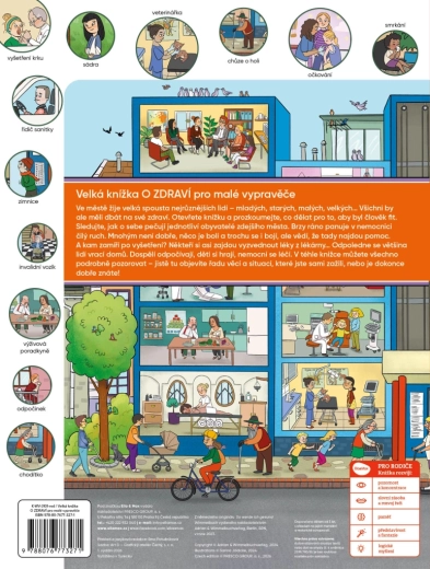 Ta velikoformatna knjiga vabi otroke k raziskovanju živahnega mesta, kjer vsi skrbijo za svoje zdravje – od jutranjega vrveža v bolnišnici do popoldanskih povratkov domov. Otroci bodo pokukali v ambulante, čakalnice in lekarne ter razumeli, da kljub temu, da nas je včasih strah, v zdravstvenih ustanovah najdemo pomoč.
