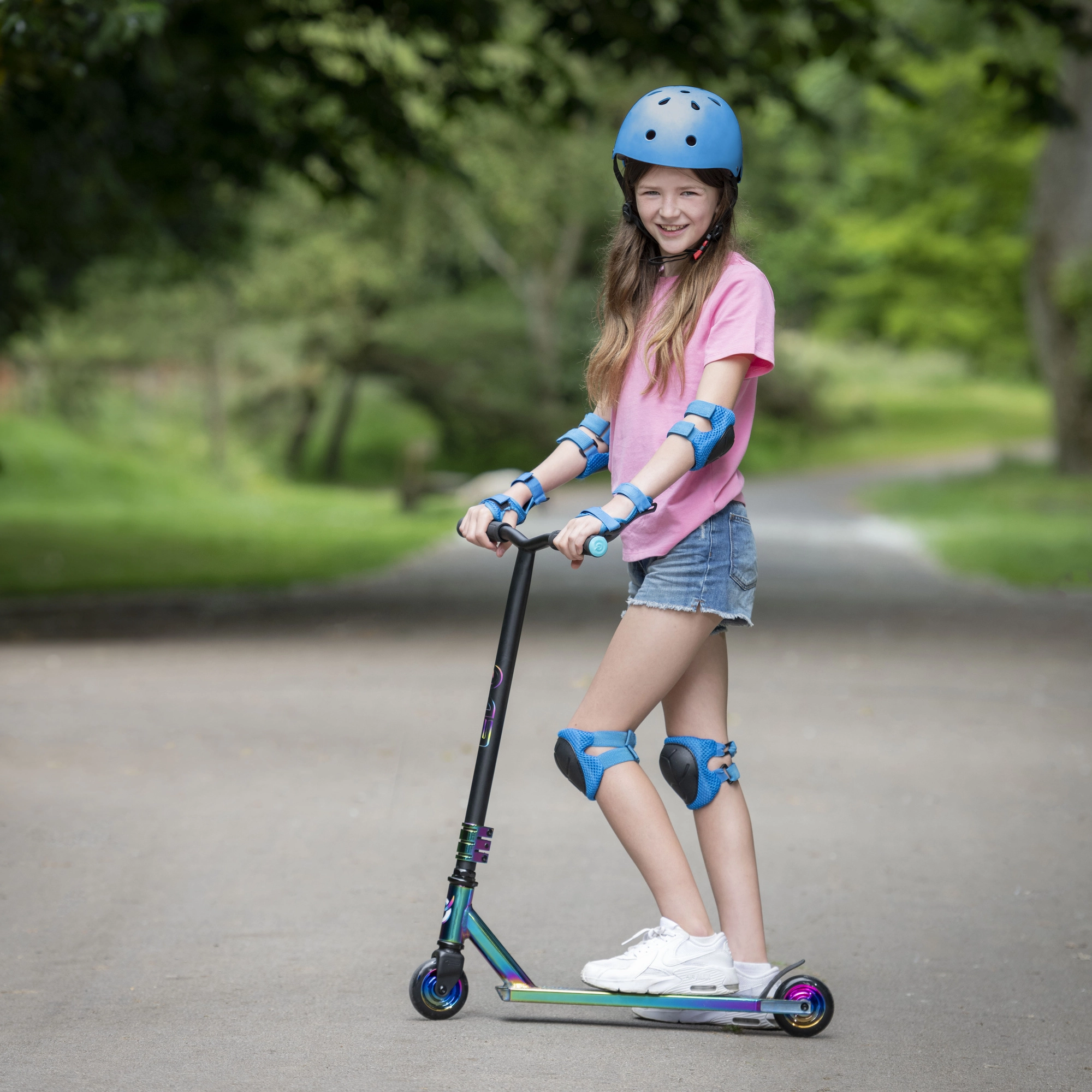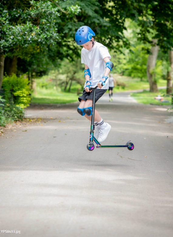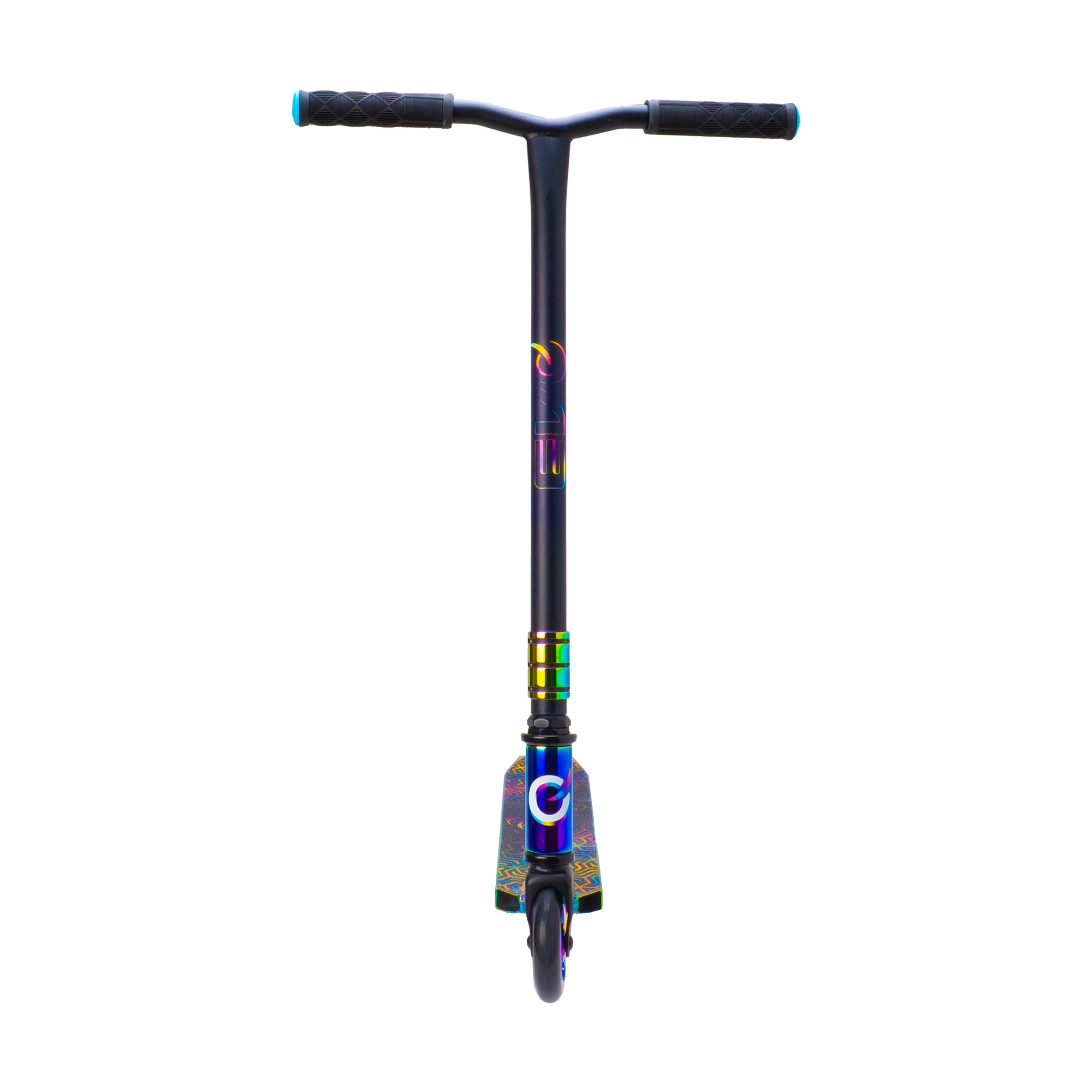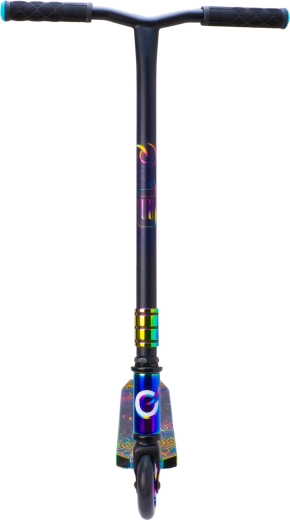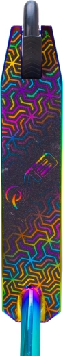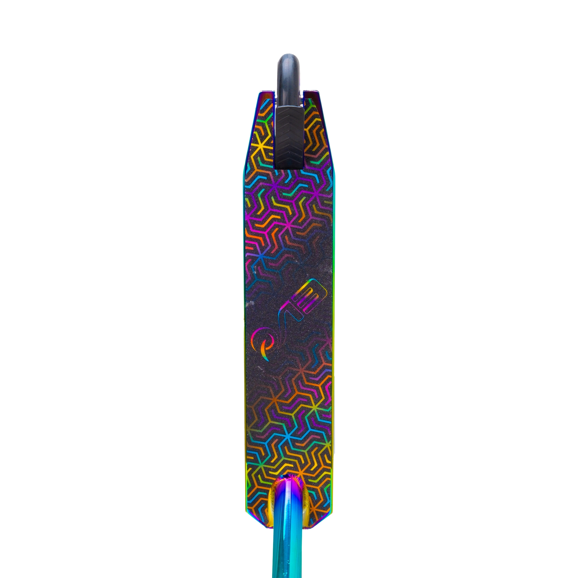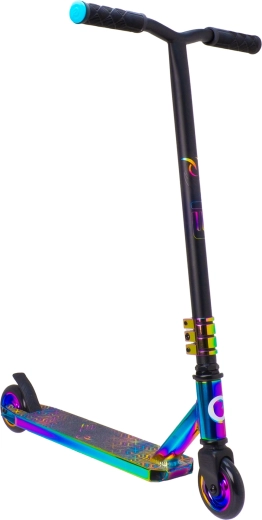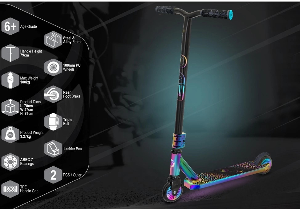 Stilski freestyle skiro EVO Neo Frenzy za otroke od 6 let ponuja trdno konstrukcijo za trike, gladko vožnjo zahvaljujoč ležajem ABEC-7 in privlačen mavrični neo-chrome videz. Ne manjkajo krmilo T-bar z udobnimi ročaji, zadnja nožna zavora in kovinsko jedro koles za stabilnost in zanesljivost v parku in po mestu.