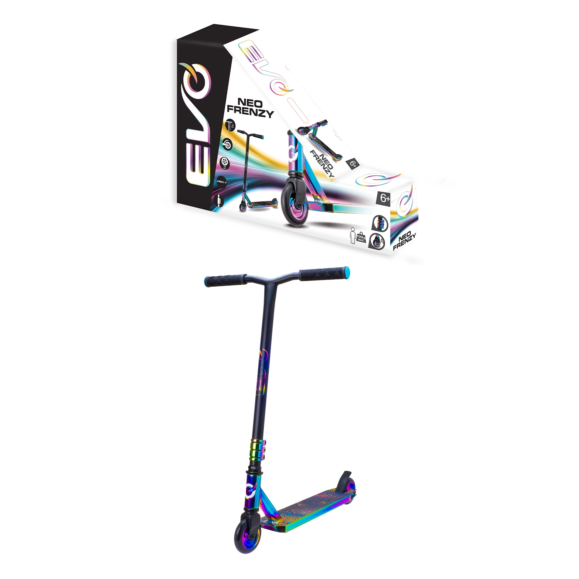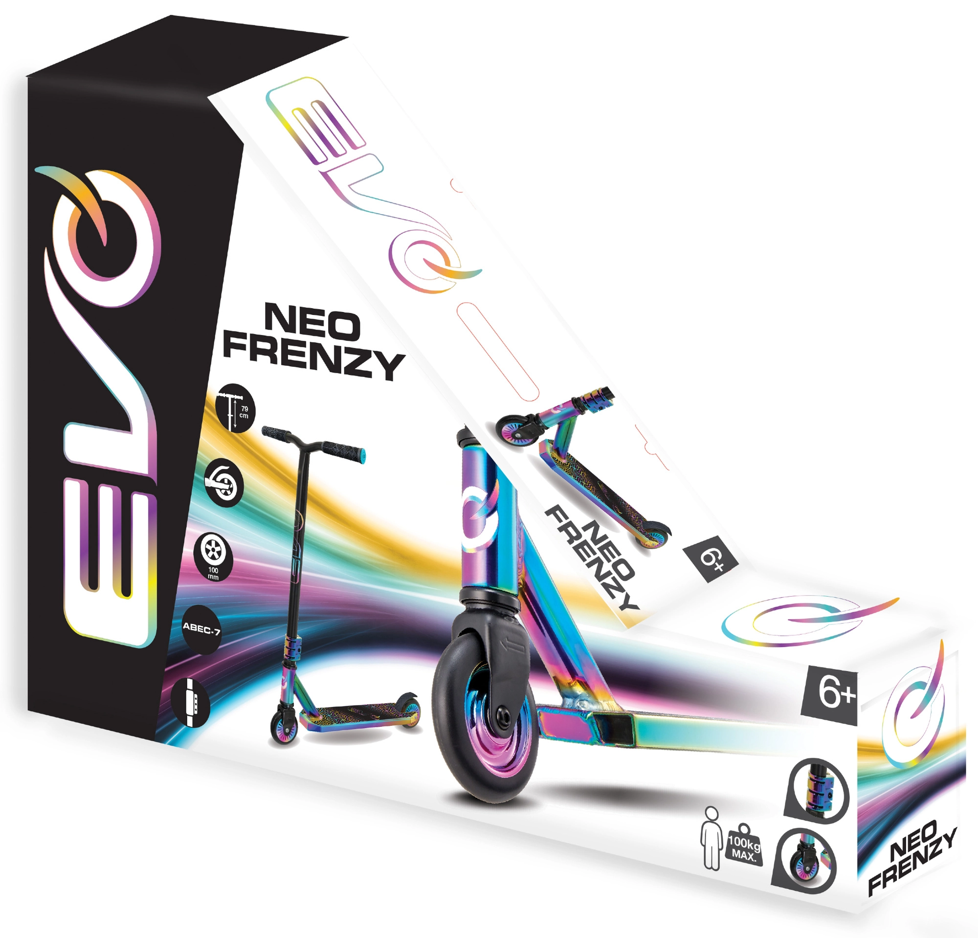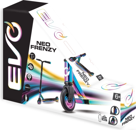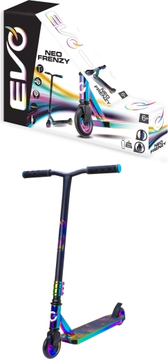 EVO Neo Frenzy je otroški stunt skiro zasnovan za učenje ravnotežja in prvih trikov. Trdna kovinska platforma z nedrsečim grip trakom in vzdržljiva vilica zagotavljata stabilnost, medtem ko majhna trda kolesa z ležaji ABEC-7 prinašajo hitro pospeševanje in gladko vožnjo. Izraziti neo-chrome detajli pritegnejo pozornost in dodajo skiroju edinstven slog.