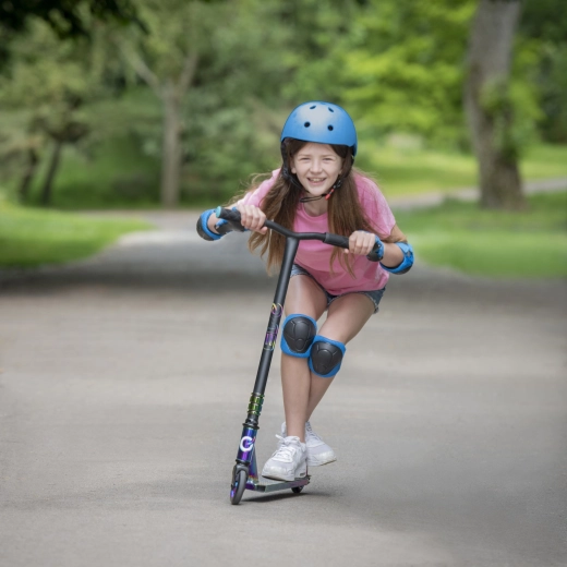 Fiksno krmilo T-bar v višini približno 79 cm ponuja natančen nadzor, trojna objemka povečuje togost sestava in zadnji blatnik/zavora omogoča varno in intuitivno ustavljanje. Skiro je idealen za začetnike, ki že imajo osnovne izkušnje in želijo nadgraditi svoje veščine v skateparku in na ravnih mestnih površinah.