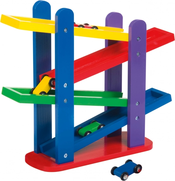Lesena dirkalna steza s tremi barvnimi avtomobilčki zagotavlja neskončno zabavo zahvaljujoč enostavnemu preklopu na kaskadnih barvnih stezah.