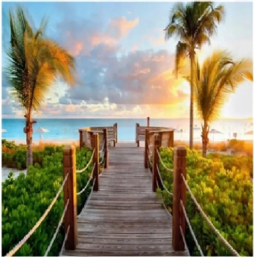 Pomirjujoče ustvarjanje in impresiven rezultat v enem. Diamantno slikanje temelji na lepljenju drobnih kamenčkov na označena mesta na platnu s pomočjo peresa in voska. Postopek je intuitiven in primeren za začetnike ter otroke pod nadzorom odraslih. Končna slika z eksotičnim motivom mostu in palm bo čudovita dekoracija vašega doma.