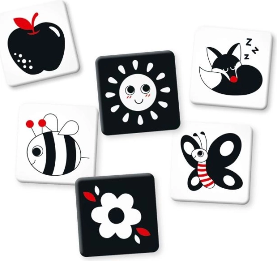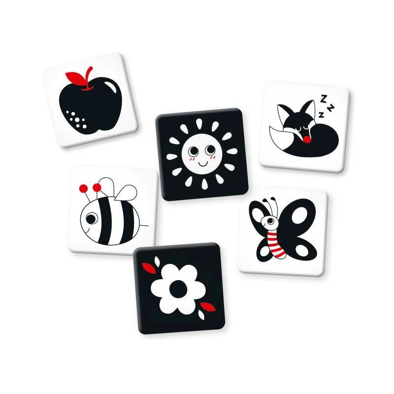Ta preprosta učna igra je idealna za mirne trenutke na podlogi, v posteljici, vozičku ali med tummy time. Zaradi kontrastov otrok prejema močne dražljaje za zgodnji kognitivni razvoj ter se uči osredotočiti na obliko, vzorec in obris.