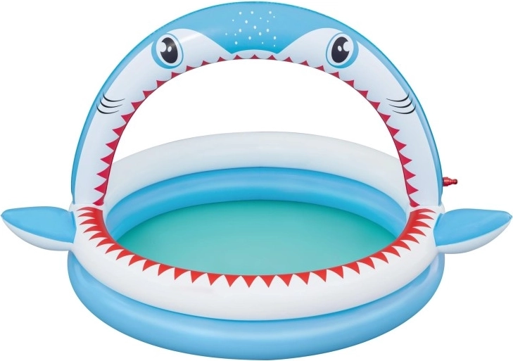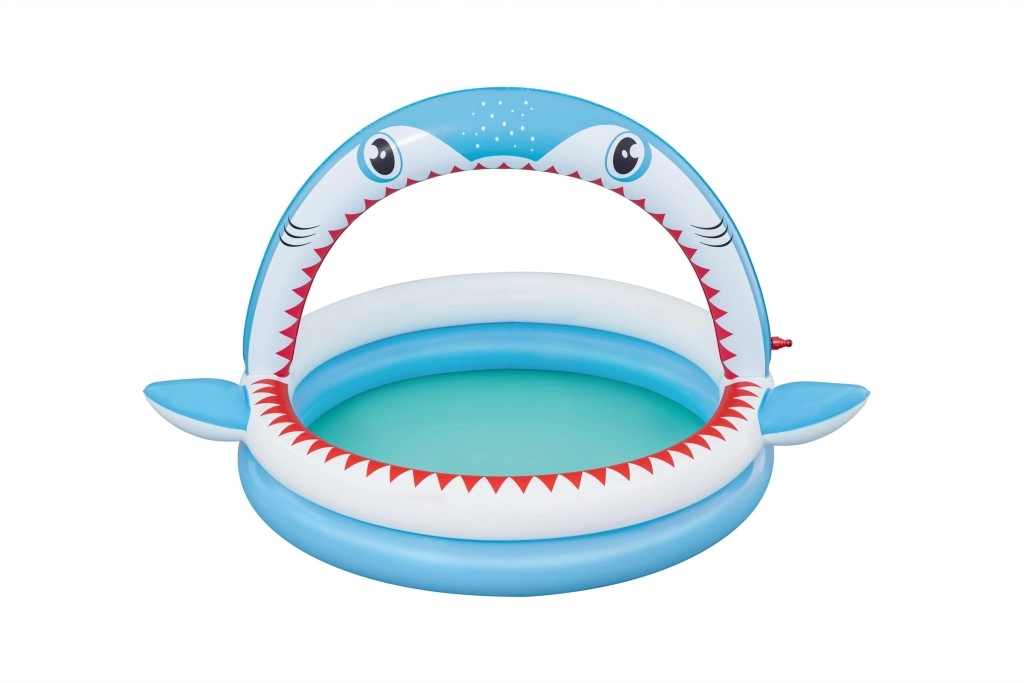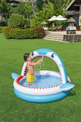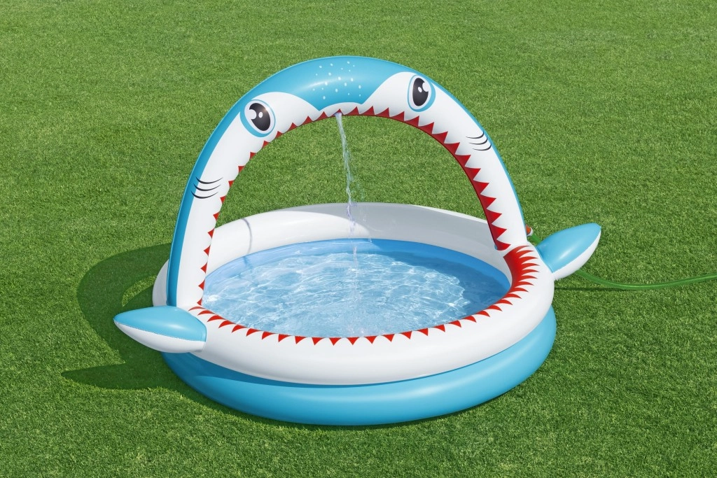 Zabaven napihljiv bazenček v obliki morskega psa z integrirano prho za osvežitev v vročih dneh. Ponuja prostornejše dimenzije 163 × 127 × 92 cm, mehke napihljive stene in vzdržljiv PVC material. Idealno za otroke od 2 let, enostavno se napihne, priključi na vrtno cev in je v hipu pripravljen za vodne vragolije.