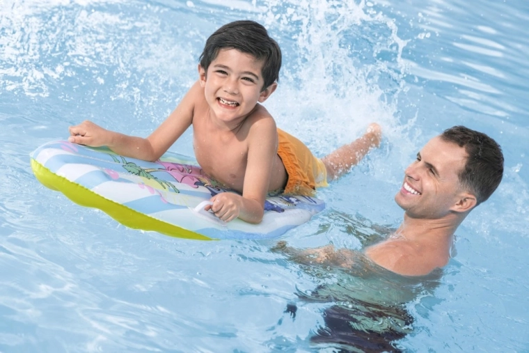 Deska je zasnovana za udobno in varno zabavo: dva stranska ročaja za zanesljiv oprijem, več komor za stabilnost in kakovosten ventil za hitro napihovanje in izpihovanje. Idealna za bazen, počitnice in jezero – spodbuja gibanje, samozavest na vodi in neskončno zabavo.