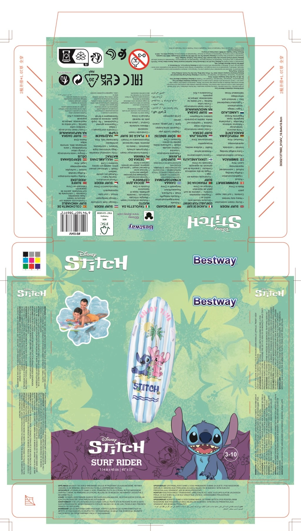 Napihljiva deska za surfanje z motivom DISNEY Stitch bo navdušila otroke z veselo grafiko s palmami, soncem in školjkami. Modro-bele črte na zgornji strani in rumeno dno povečujejo vidnost na vodi, medtem ko nizka teža olajša prenašanje in rokovanje.