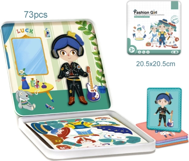 Ta elegantni komplet prinaša otrokom neskončne možnosti oblačenja in kombiniranja. S 62 koščki lahko ustvarjajo lastne modne kreacije, se navdihujejo z vzorčnimi kartami in s priloženim suho brisljivim flomastrom dodelajo dodatke ali podrobnosti oblačil. Trpežna kovinska škatlica je praktična za shranjevanje in prenašanje, zato je sestavljanka primerna za dom, izlete in počitnice.