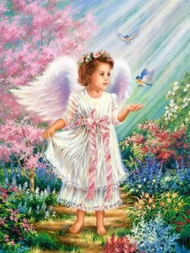 Diamantno slikanje je priljubljena sprostitvena tehnika, pri kateri postopoma lepite drobne kamenčke na označena mesta na platnu ter ustvarite bleščečo mozaik sliko. Motiv angelčka s ptički izstopa z nežnimi detajli in sijočimi odsevi, zaradi katerih bo končno delo čudovita dekoracija ali darilo.