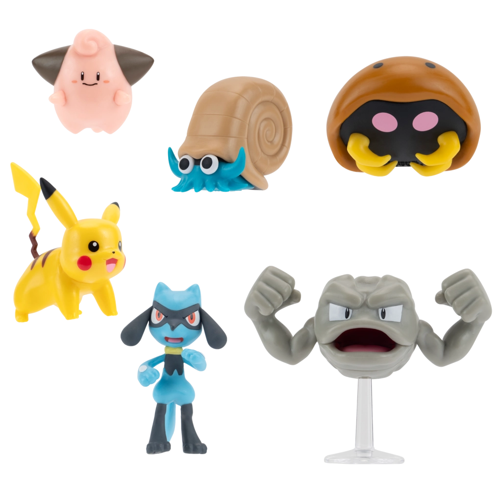 V pakiranju najdete šest priljubljenih Pokémonov – od ikoničnega Pikachu, prikupne Cleffe in energičnega Rioluja do klasik iz regije Kanto: Geodude, Omanyte in Kabuto. Komplet je idealen kot darilo za otroke in zbiratelje, za razširitev obstoječe kolekcije ali kot okras igralnega kotička.