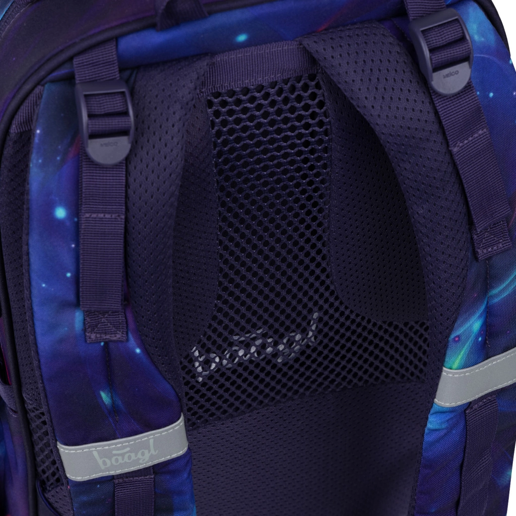 Anatomsko oblikovan hrbtni panel z zračenjem, podloženi in nastavljivi naramni trakovi ter prsni pas zagotavljajo zdravo razporeditev bremena skozi celoten šolski dan.