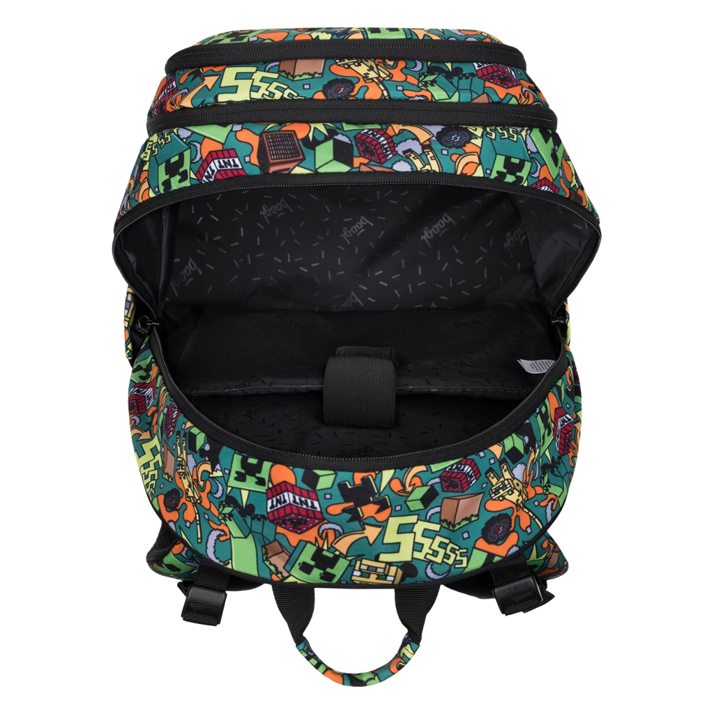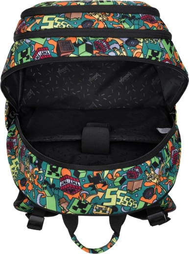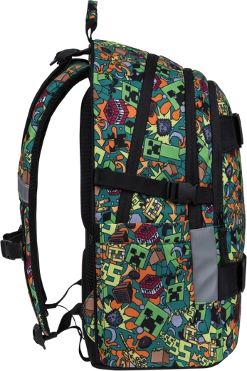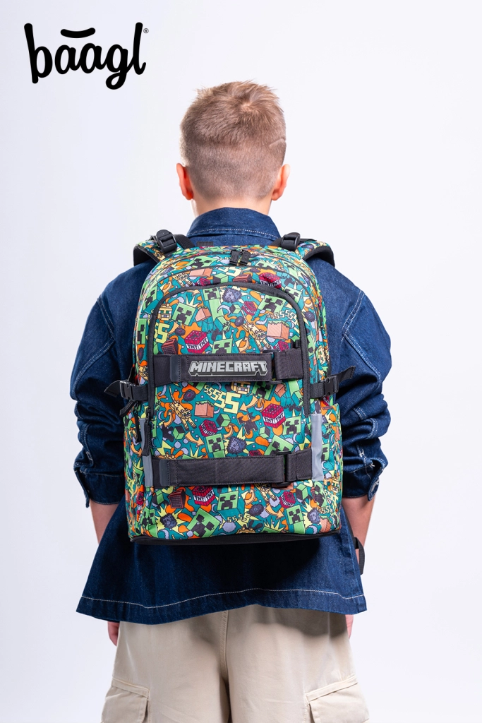 Šolski set BAAGL Skate MINECRAFT Chaos je zasnovan za udobno vsakodnevno nošenje od 3. razreda osnovne šole dalje. Nahrbtnik s težo do 900 g ponuja tri glavne predelke, notranji organizator in podložen žep za 15" prenosnik ali tablico. Zahvaljujoč anatomsko oblikovanemu hrbtu, popolnoma nastavljivim kompresijskim trakovom in odsevnim elementom je primeren tako za šolo kot prosti čas.