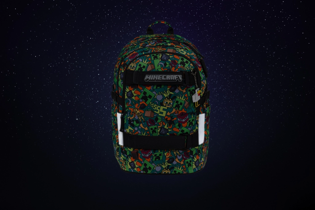 Zahvaljujoč anatomsko oblikovanemu hrbtišču, nastavljivim trakom in odsevnimi elementi je komplet varen in udoben za nošenje. Vsi deli so iz vodoodpornega recikliranega materiala in uporabljajo zanesljive zadrge YKK za dolgo življenjsko dobo. Dizajn, poenoten z motivi MINECRAFT, zlahka uskladite v enoten slog.