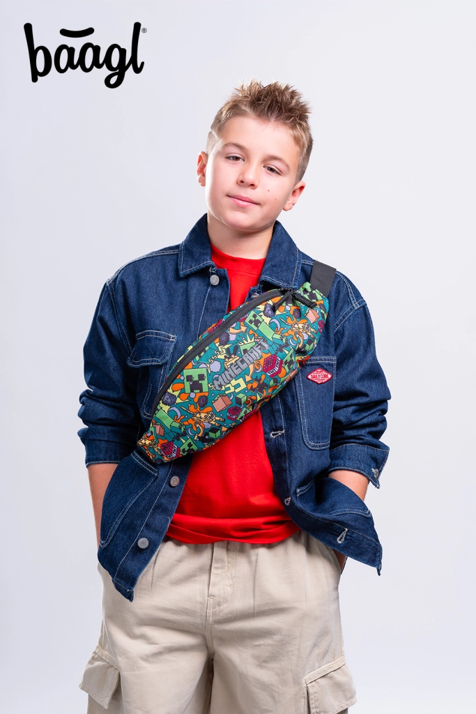 Stilska ledvena torbica BAAGL v priljubljenem dizajnu MINECRAFT Chaos je praktičen dodatek za vsak dan. Ponuja dvosmerno zadrgo YKK, obojestransko nastavljive trakove in močno zaponko MEICO. Je vodoodporna, izdelana iz recikliranega materiala in kljub temu izjemno lahka – tehta le 100 g pri prostornini 4,5 l.