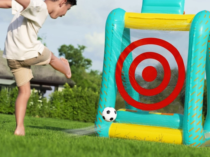Napihljiv večnamenski komplet Bestway Perfect Aim 3-v-1 spremeni dvorišče, vrt ali prostorno dnevno sobo v areno, polno gibanja. Radodarne dimenzije omogočajo sočasno igro več otrok, mehke PVC stene pa povečajo varnost pri vsakem odboju.
