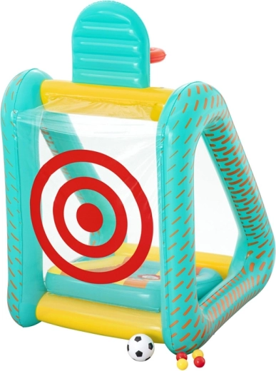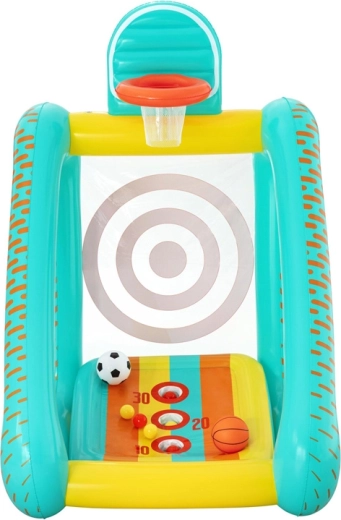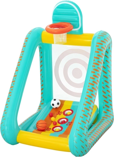Zaženite zabavo na vrtu ali doma z napihljivim igralnim središčem 3-v-1 znamke Bestway. Otroci bodo uživali v košarki, nogometu in metih na tarčo v enem kompletu. Stabilna z vodo napolnjena osnova, mehka in varna konstrukcija ter popolna oprema, vključno z ročno tlačilko in žogami, zagotavljajo takojšnjo in varno igro za otroke od 5 let naprej.