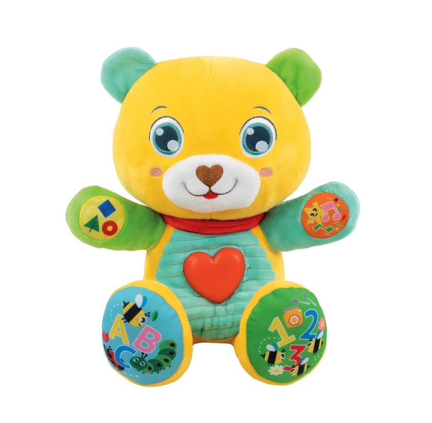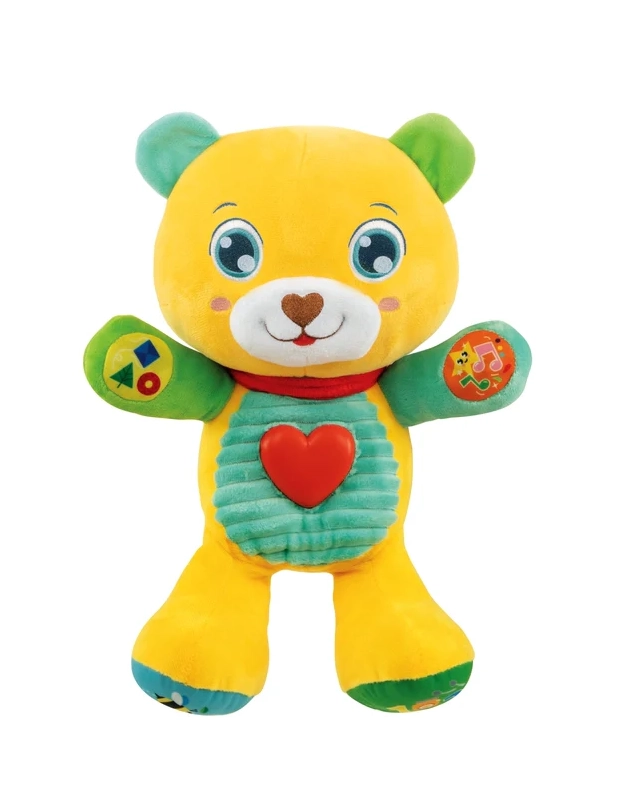 Otrok se s pomočjo 5 dotikalnih gumbov uči prepoznavati črke, številke, barve in like. Svetleči srček zasveti, ko medvedek govori ali poje vesele pesmice in izštevanke, kar spodbuja senzorično stimulacijo, ritem in fino motoriko.