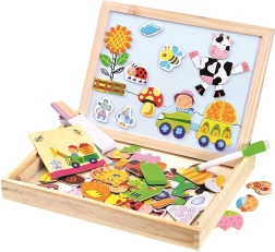 Vsa ta kreativna orodja in deli so shranjeni v leseni škatli, ki je lahko prenosljiva. Otroci se bodo s to tablo na temo farme zabavali dolge ure ter razvijali svojo domišljijo in spretnosti.