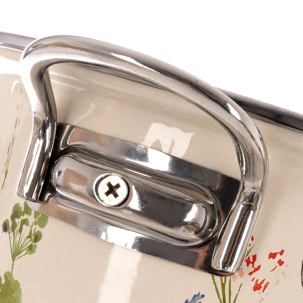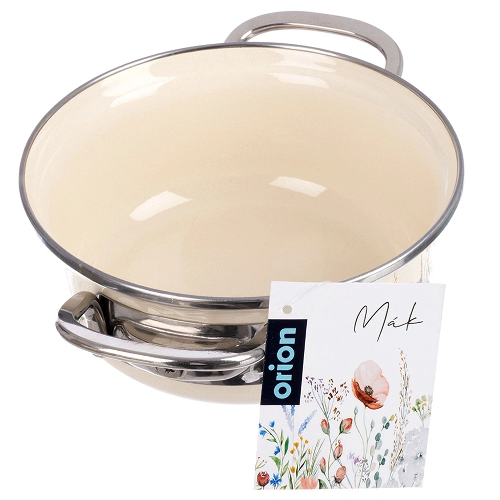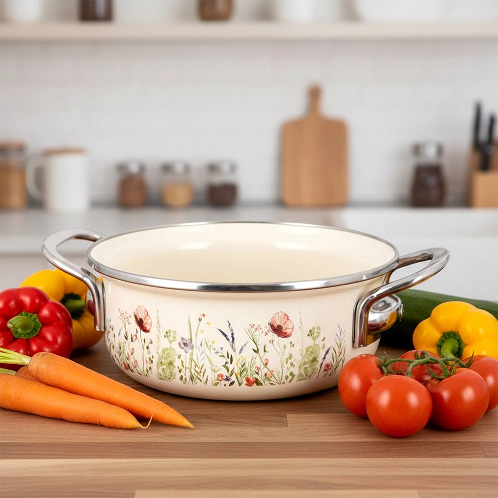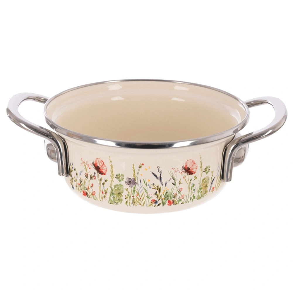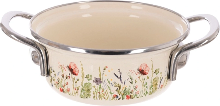 Eleganten emajliran lonec v krem barvi z motivom travniških cvetov je idealen za vsakodnevno kuhanje in dušenje. Ponuja prostornino 950 ml, premer 16 cm in dva trdna nerjaveča ročaja za varno rokovanje. Primeren za vse vrste štedilnikov, vključno z indukcijo, tudi za pečico in pomivalni stroj. Zdravju neškodljiv emajl je obenem prijazen tudi alergikom.