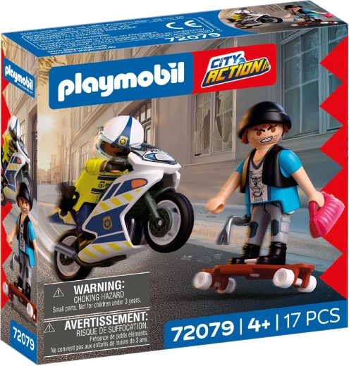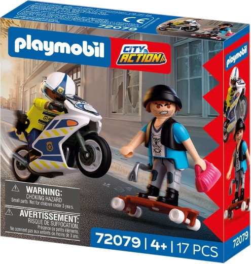 Začnite napeto akcijo v mestu z igralnim kompletom PLAYMOBIL City Action. Policist na motorju zasleduje tatu na skateboardu in se trudi dobiti nazaj ukradeno torbico. Komplet vsebuje 2 figurici, policijski motor, longboard/skateboard in številne avtentične dodatke za realistično igro vlog.