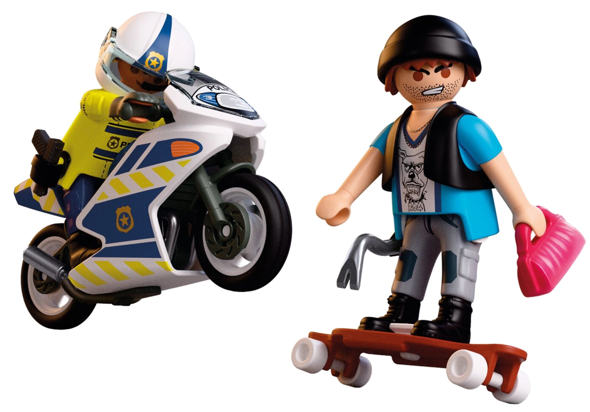 - Vsebina kompleta: 2 figurici (policist in tat, približno 7,5 cm), policijski motor, skateboard/longboard, čelada, rokavice, tok, pištola, čepica, torbica, nosilec in pajser.