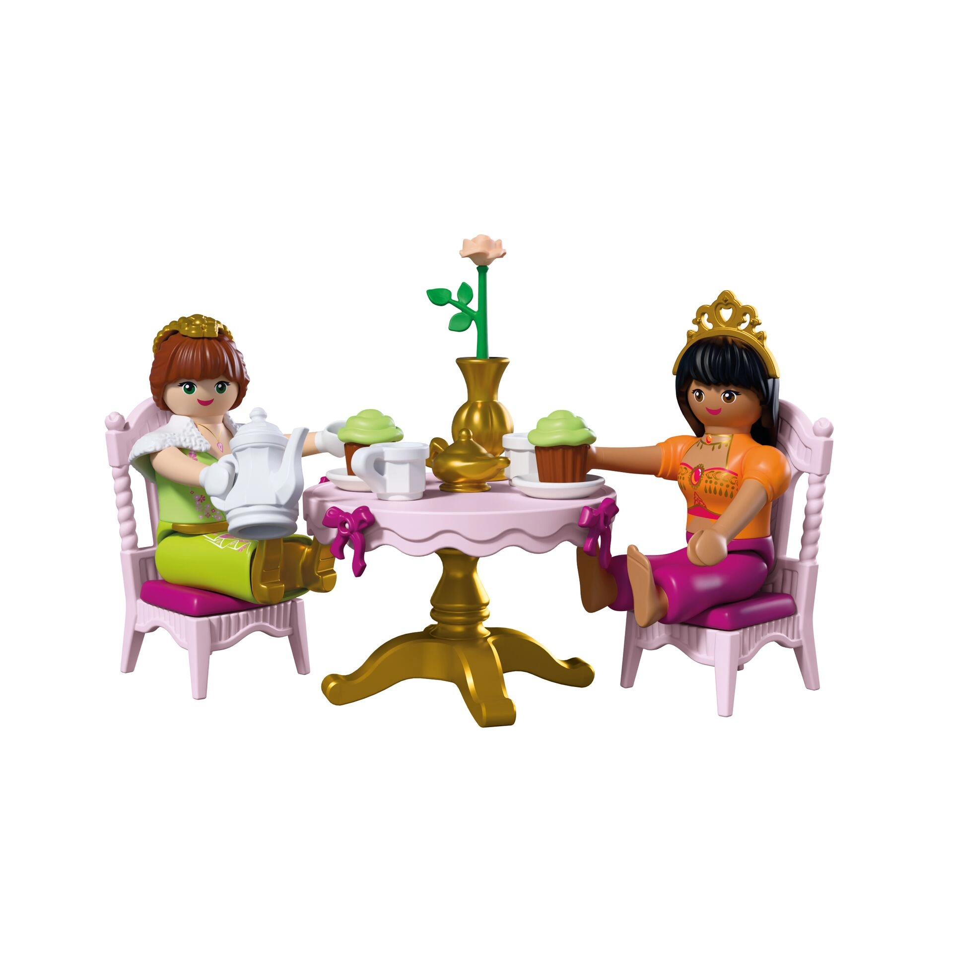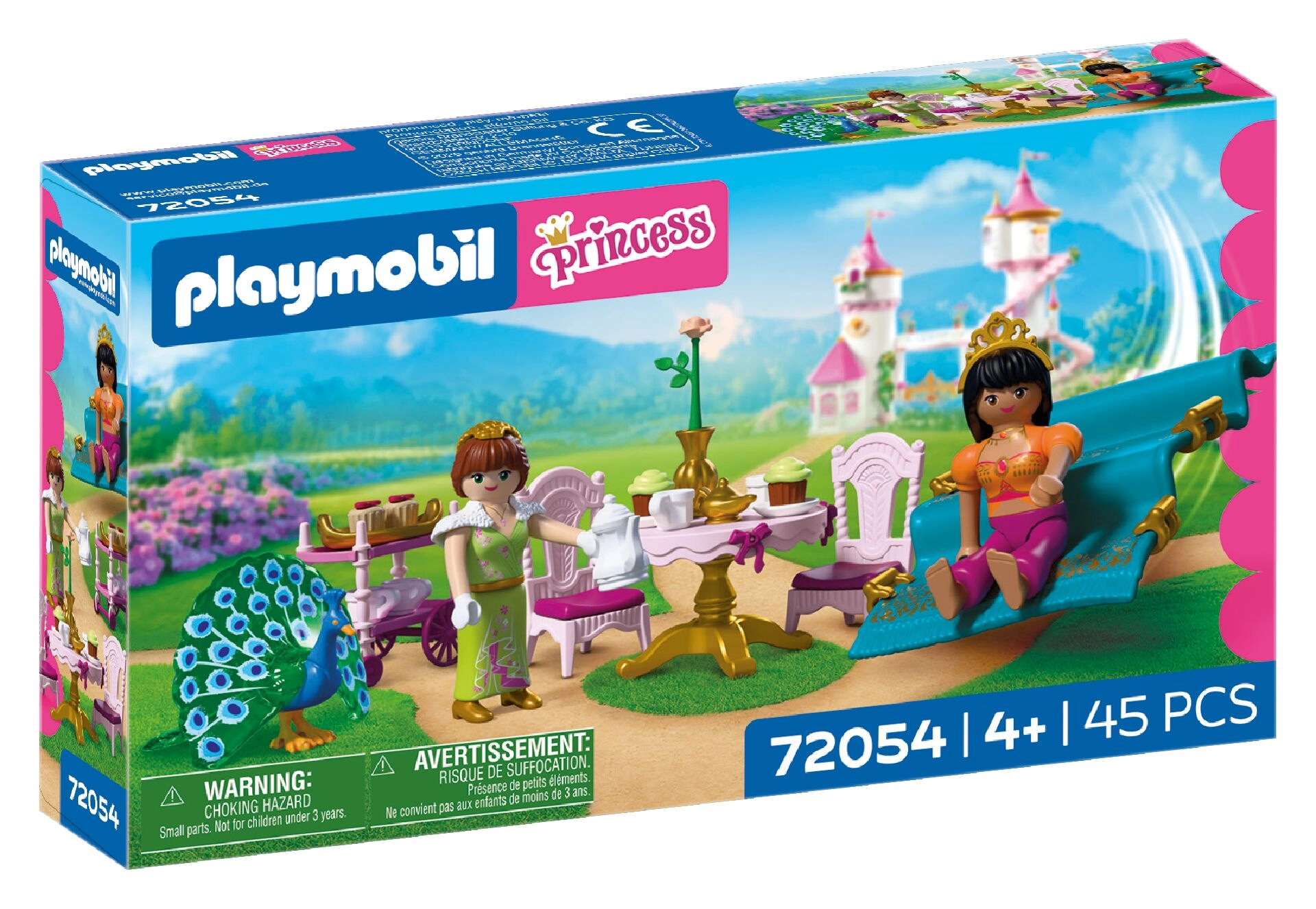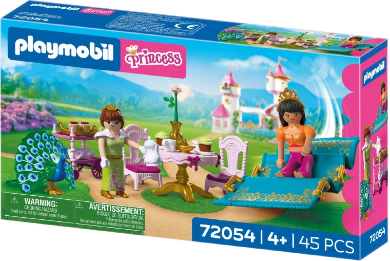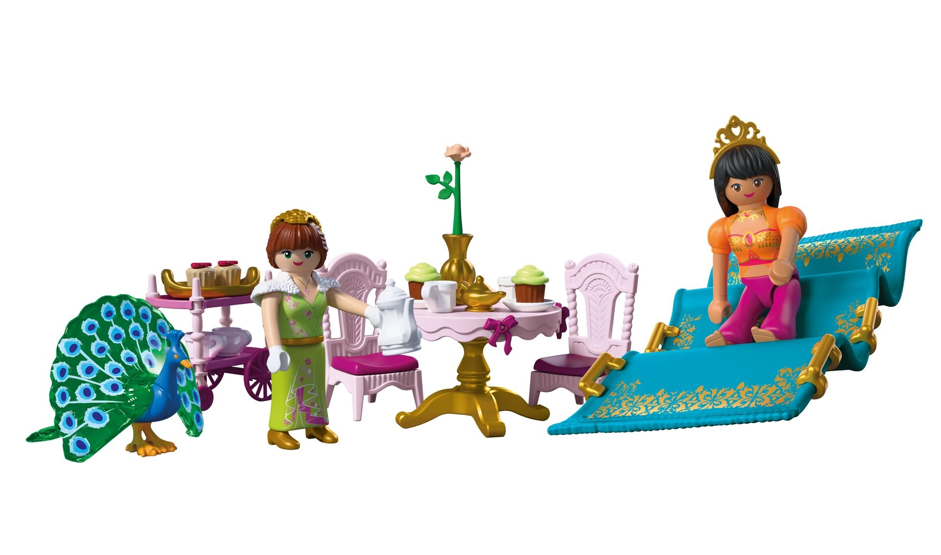 Očarljiv set PLAYMOBIL za ljubitelje pravljic: dve princeski uživata popoldanski čaj v palačnih vrtovih, pripeljeta se na letečem preprogu in postrežeta dobrote z servirnega vozička. Del seta je tudi elegantna čajna garnitura, prisrčni cupcaki in veličasten pav za še več domišljijskih zgodb. Set ponuja bogate dodatke in spodbuja kreativno igranje vlog.