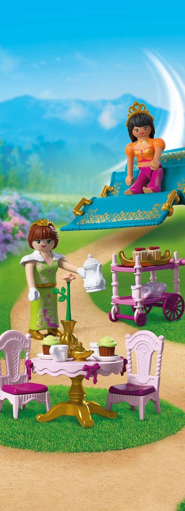 Potopite se v pravljični svet s setom PLAYMOBIL, kjer princeska pozdravi svojo prijateljico na stilski čaj na vrtu. Leteči preprog poskrbi za efektni prihod, medtem ko okrogla miza, stolčki in servirni voziček pripravijo popolno zaledje za goste. Podrobni dodatki in gibljive figurice navdihujejo otroke k izmišljanju lastnih zgodb.