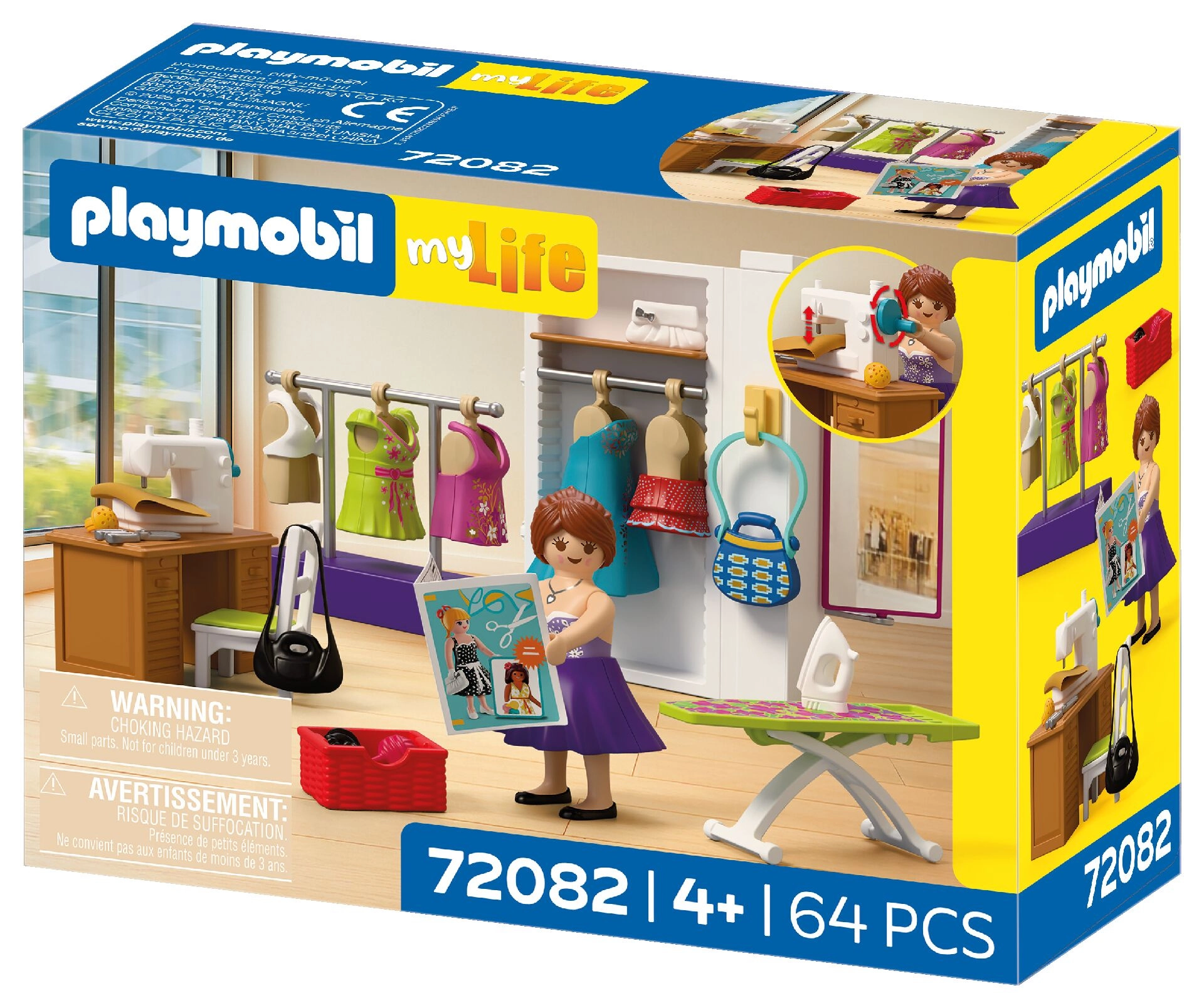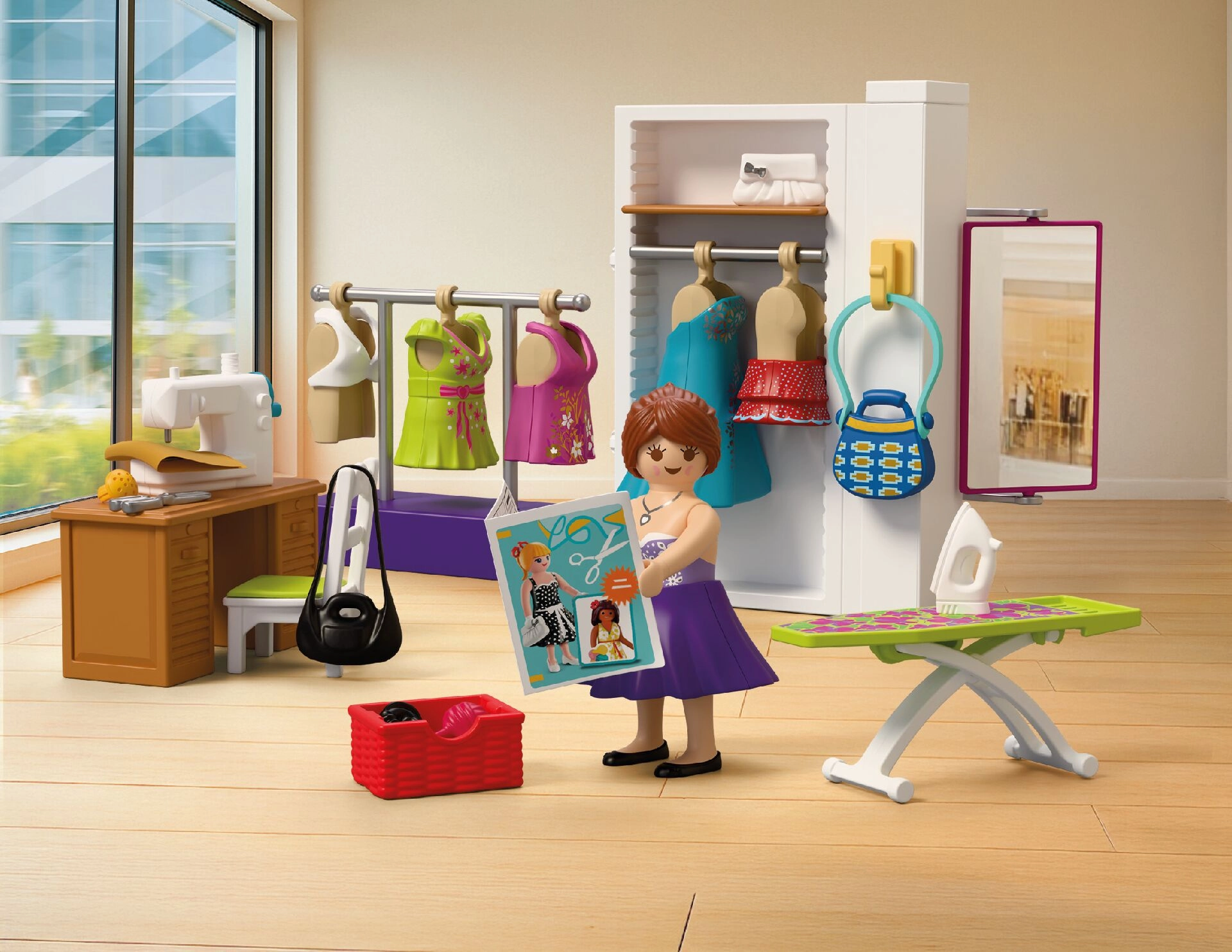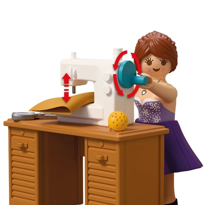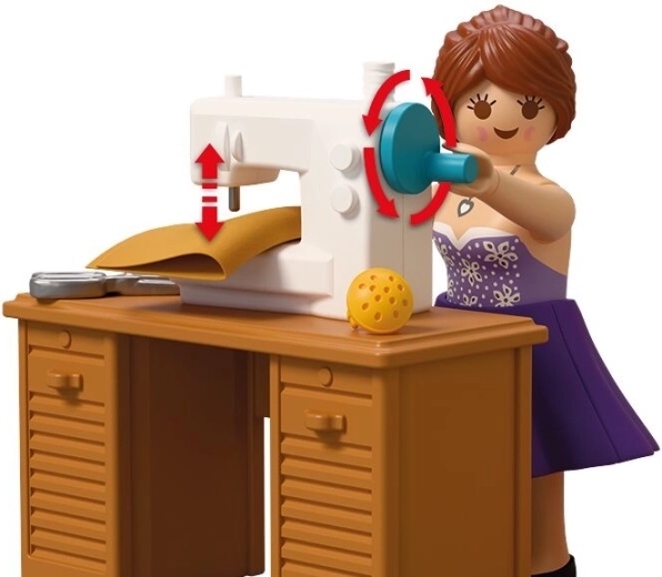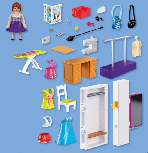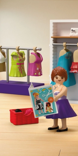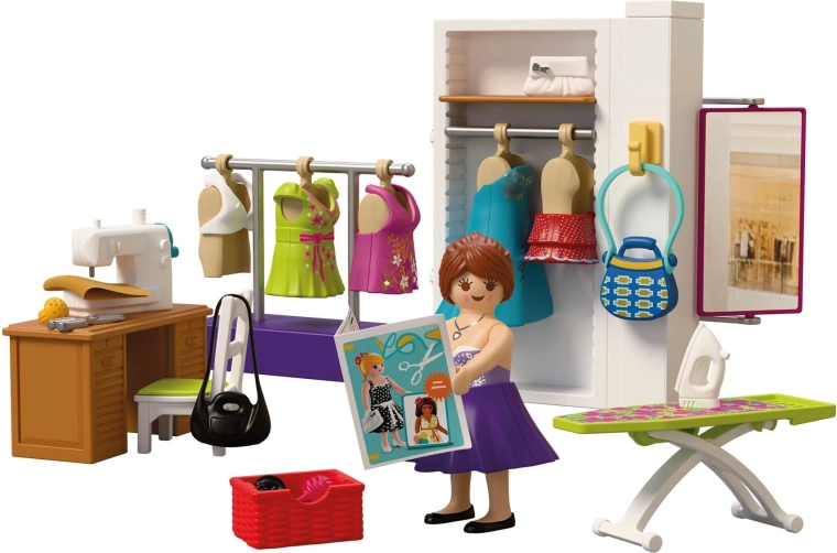 Vsebovano je vse za popoln modni atelje: miza, stol, tkanine, škarje, jehelnik, klobčič volne, torbice in druge malenkosti. Komplet vsebuje 64 delov in ga je mogoče kombinirati z drugimi seti PLAYMOBIL za še bogatejše zgodbe.
