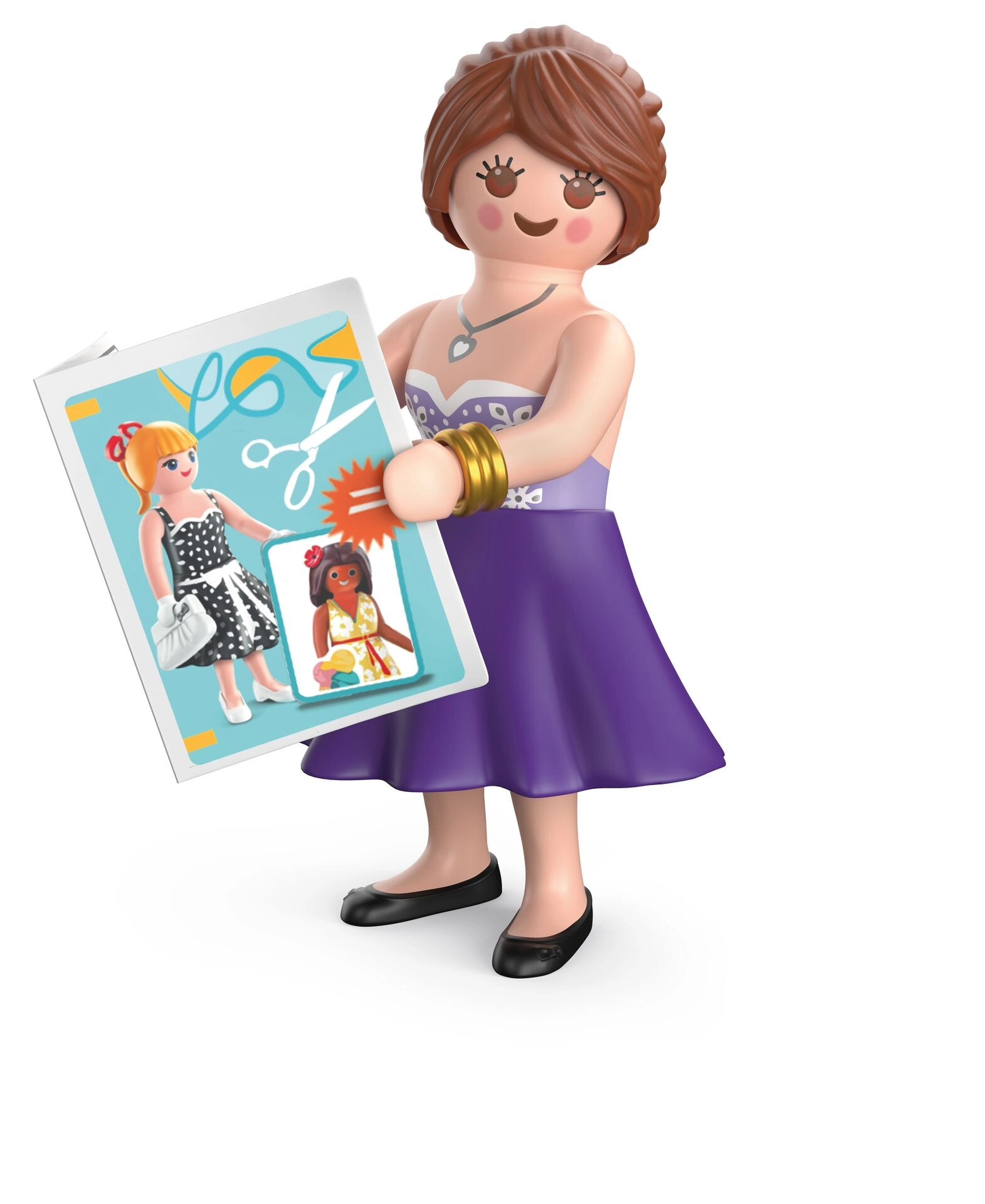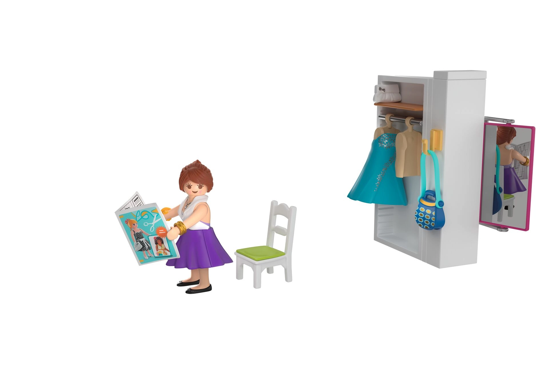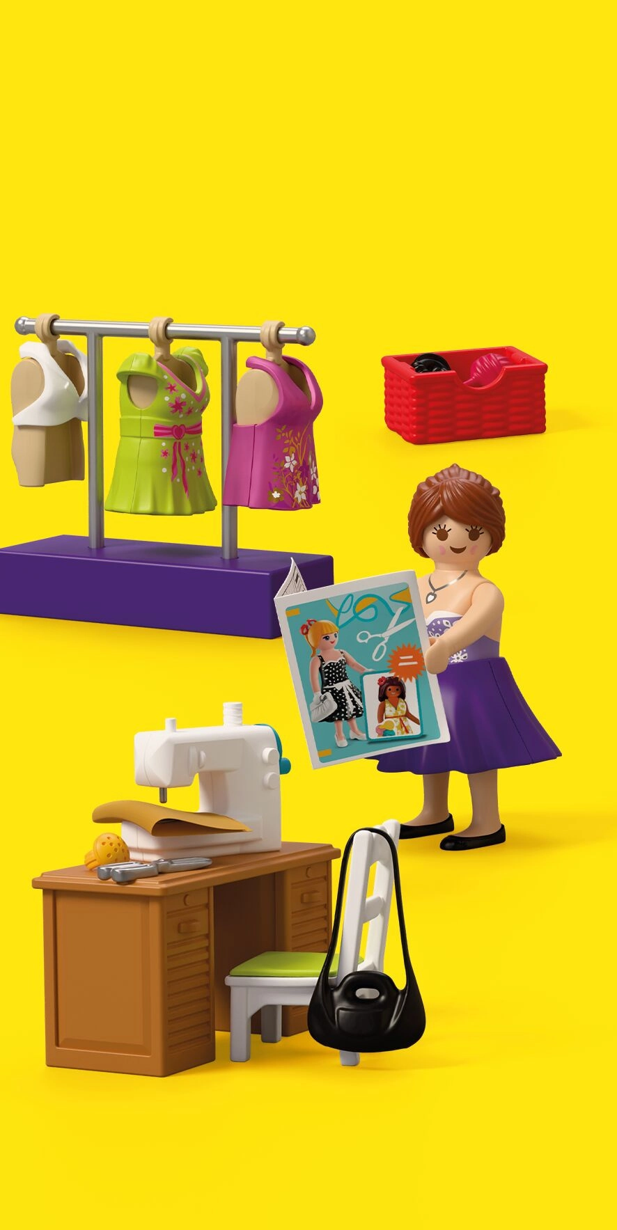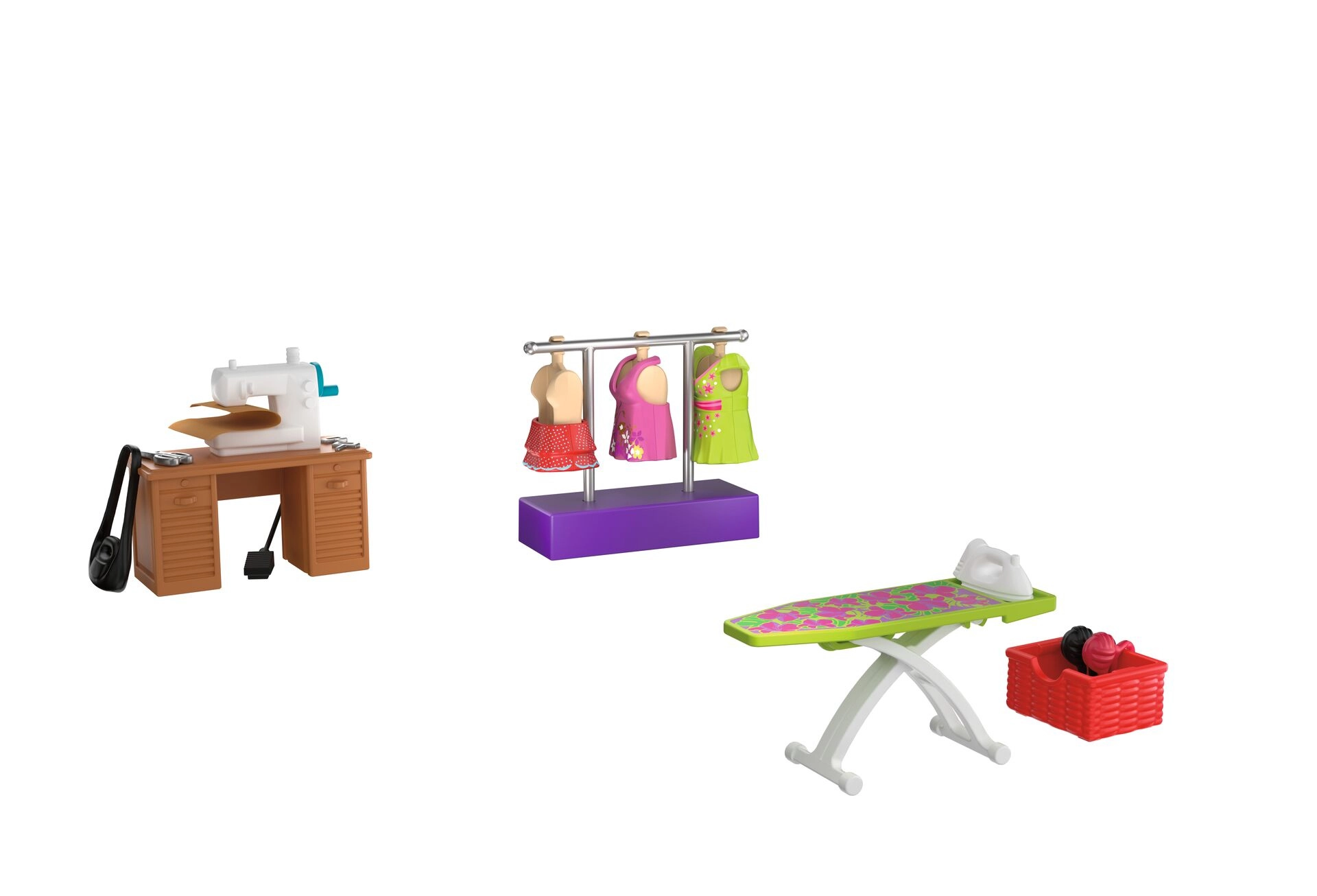 Vsebovano je vse za popoln modni atelje: miza, stol, tkanine, škarje, jehelnik, klobčič volne, torbice in druge malenkosti. Komplet vsebuje 64 delov in ga je mogoče kombinirati z drugimi seti PLAYMOBIL za še bogatejše zgodbe.