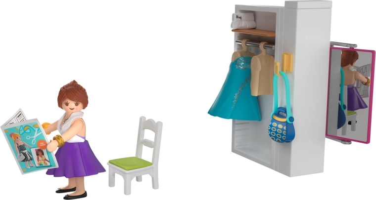 Vstopite v ustvarjalni svet z igralnim kompletom PLAYMOBIL Moje življenje – modna oblikovalka. Otroci lahko oblikujejo in preizkušajo obleke, krila in tope, šivajo na šivalnem stroju, likajo in usklajujejo dodatke. Premično ogledalo, garderobna omara, obešalniki in bogato pribor spodbujajo domišljijo in igro vlog.
