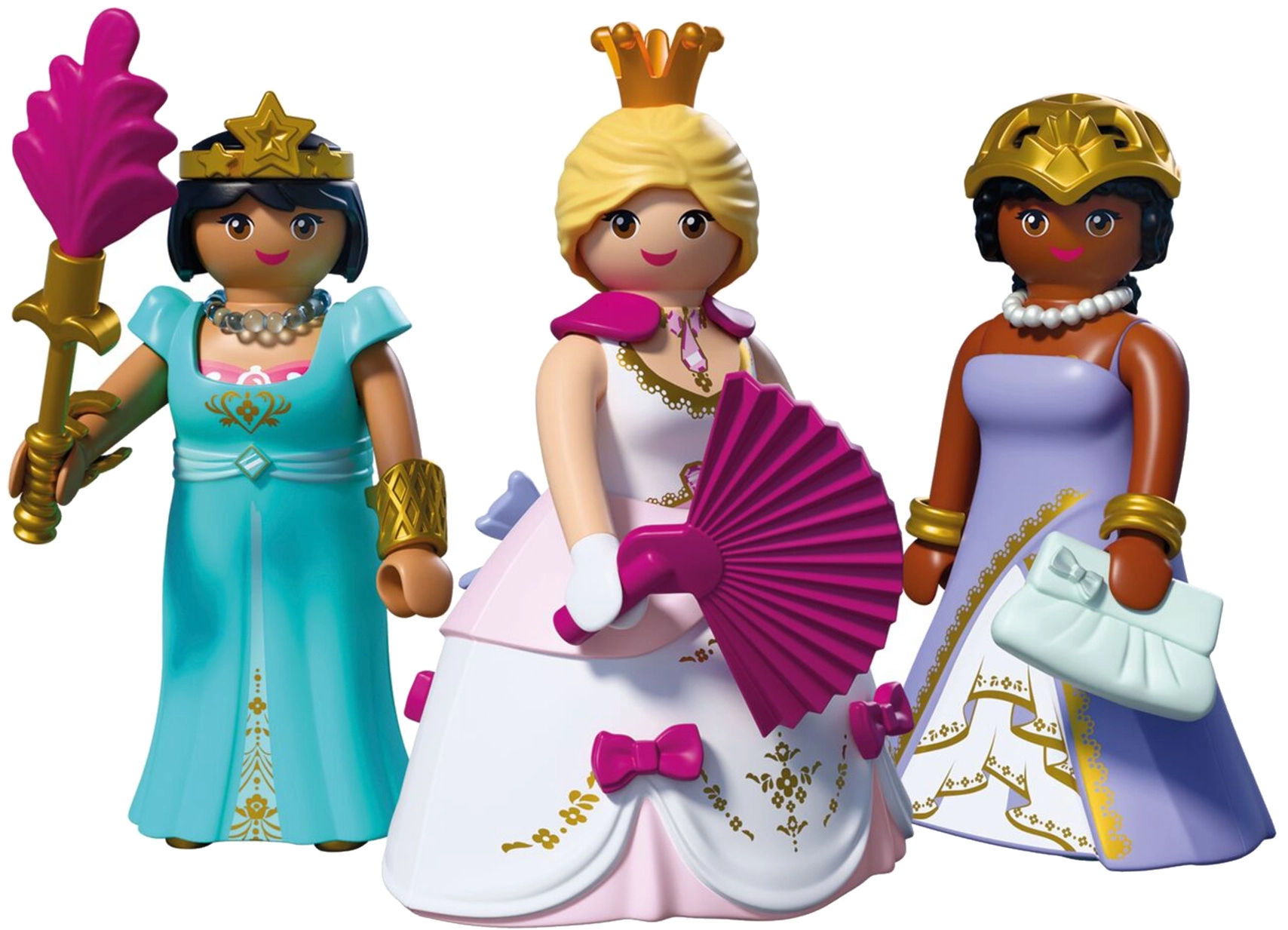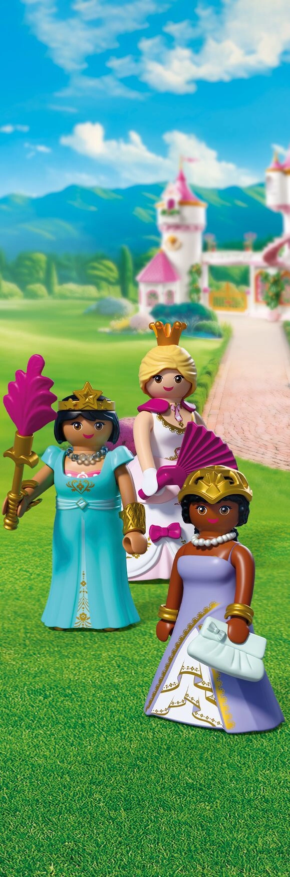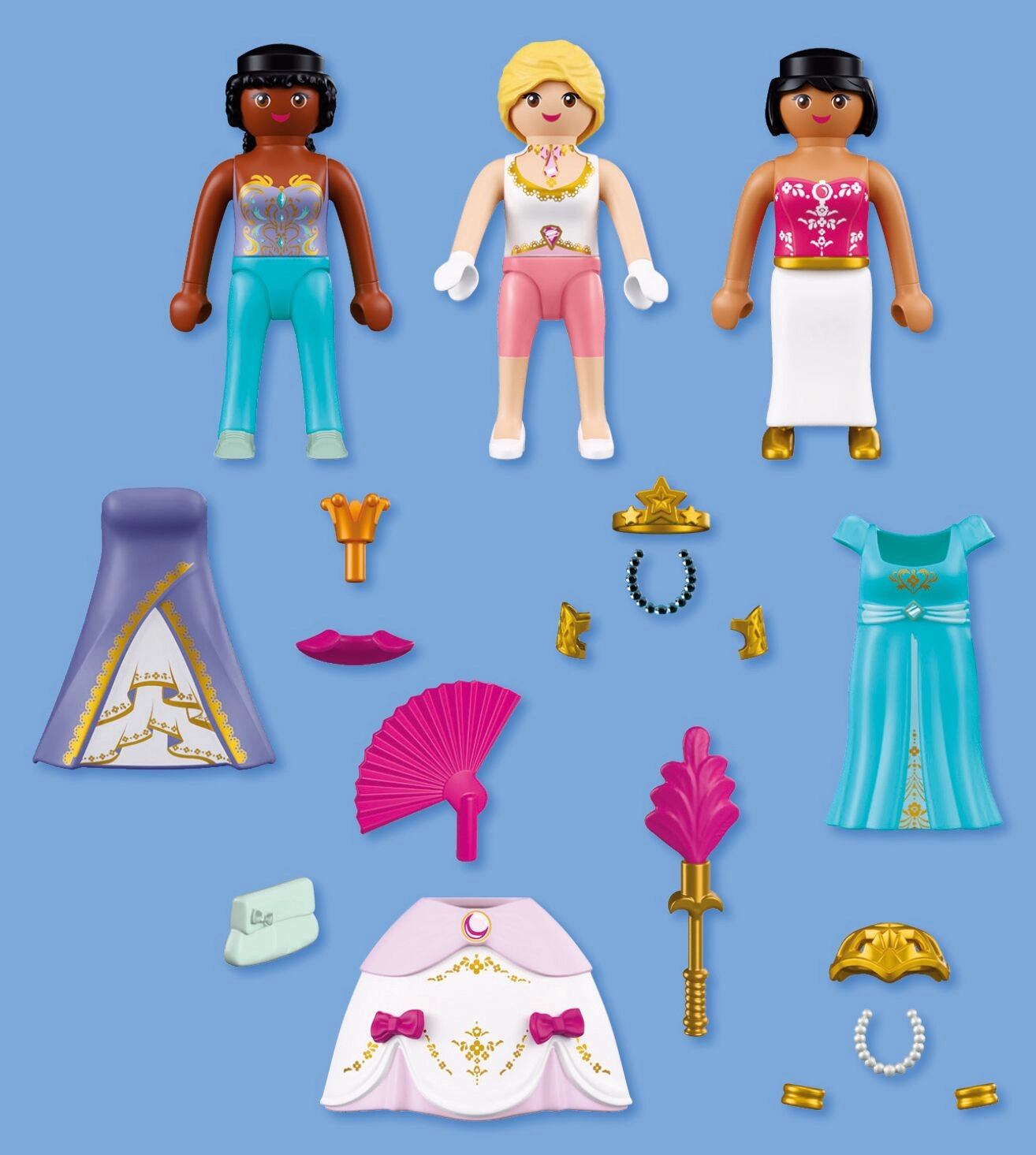 Tri očarljive princese vabijo otroke v svet kraljevskih pustolovščin. Zahvaljujoč zamenljivim oblekam, krilom in nakitu lahko mali ustvarjalci zlahka spreminjajo videz figuric in si izmišljujejo vedno nove zgodbe – od veličastnega plesa do sprehodov po grajskih vrtovih.