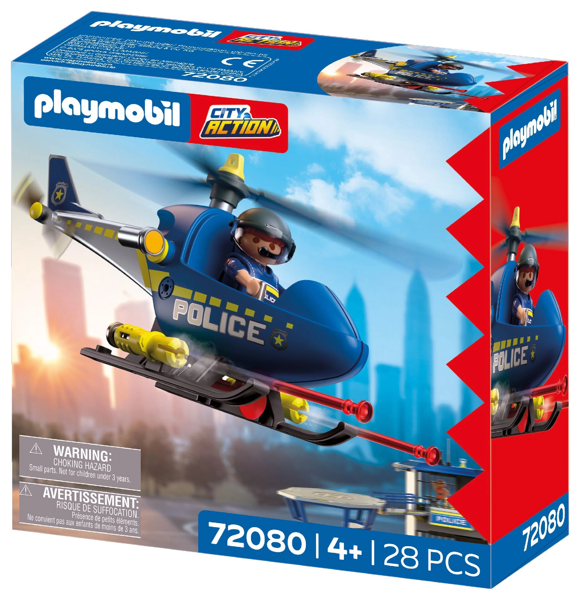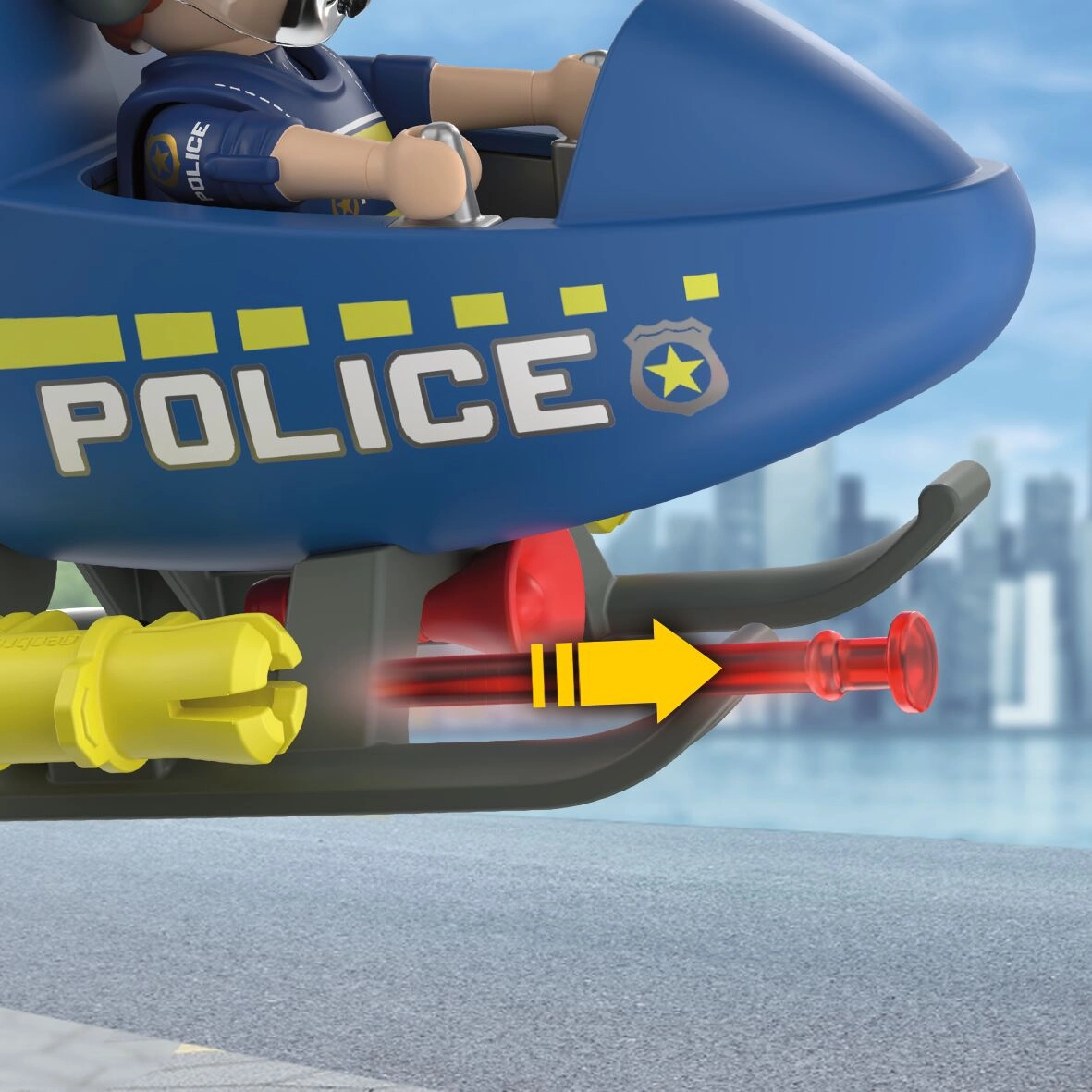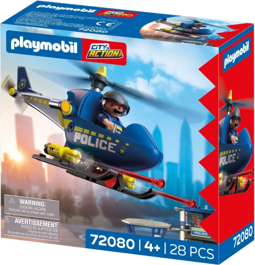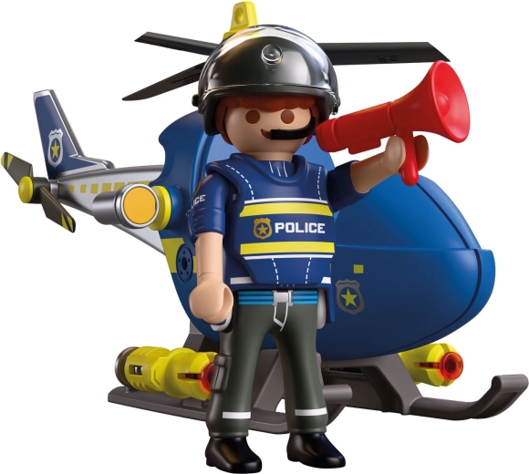 Komplet PLAYMOBIL City Action prinaša dinamično akcijo v otroško sobo. Helikopter z vrtečimi se rotorji omogoča gladke manevre, medtem ko policist nadzoruje območje, sporoča prek megafona in izvaja varnostne opozorilne strele. Otroci zlahka ustvarjajo lastne zgodbe, polne napetosti in pustolovščin.