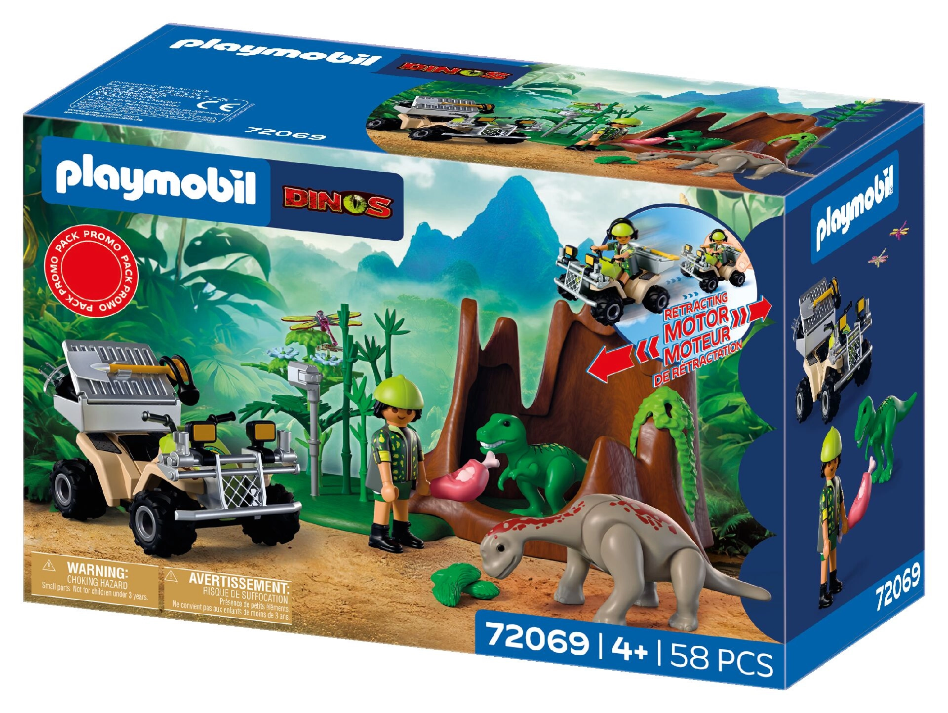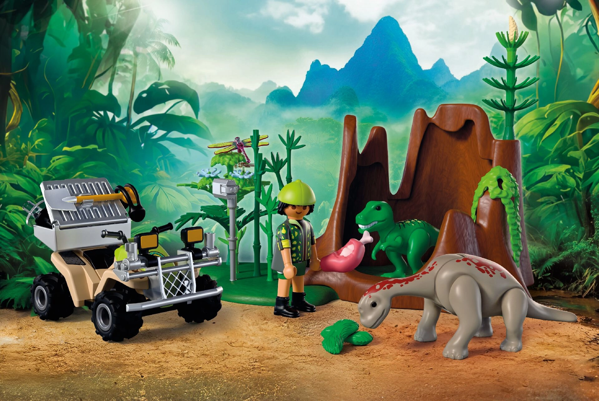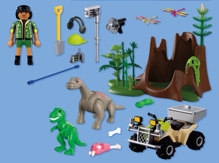 Podajte se na avanturistično odpravo v svet dinozavrov. Raziskovalec na robustnem štirikolesniku s povratnim (pull-back) pogonom se vozi skozi bujno vegetacijo, kjer odkriva skrite mladiče T‑rexa in Brahiozavra. S pomočjo opreme dokumentira zvoke, beleži vedenje in jih hrani s primerno hrano. Zahvaljujoč odstranljivi transportni skrinji in prostoru za shranjevanje orodij je vsaka odprava enostavna in pregledna.