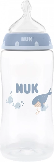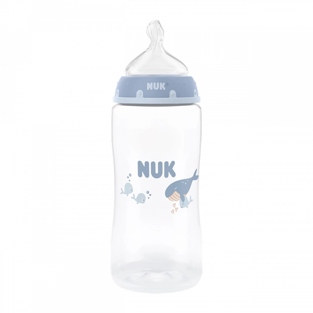Izdelano v Nemčiji iz kakovostnega polipropilena brez BPA; steklenička je lahka, trpežna in prijetna za držanje. Široko dno zagotavlja stabilnost, nežno oblikovano telo stekleničke omogoča varno prijemanje in enostavno čiščenje. Dizajn Whale navdušuje z igrivim videzom, steklenička pa je popolnoma združljiva s sistemom NUK First Choice za neomejene kombinacije.