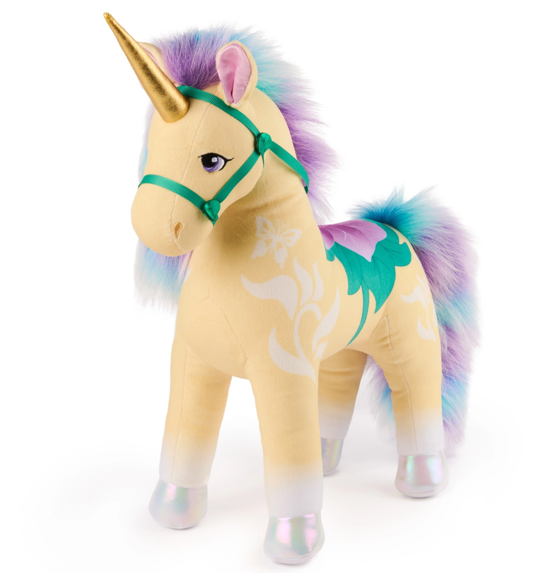 Zlat rog, opalizirajoča kopita in botanično sedlo z uzdo v zeleno‑vijoličnih barvah zvesto prikličejo lik Leaf iz sveta Unicorn Academy.