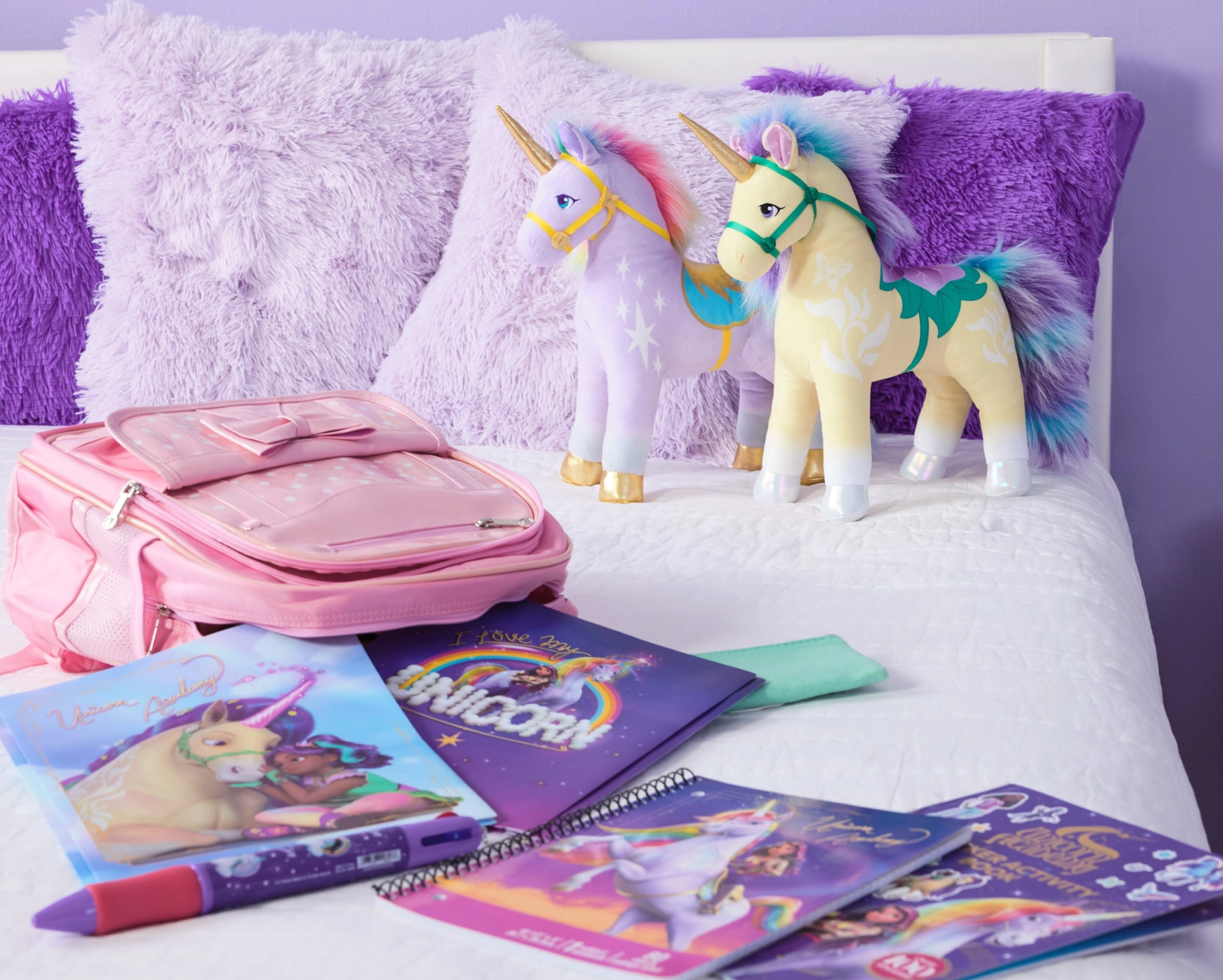 - Dizajn Unicorn Academy: botanično sedlo in uzda v zeleno‑vijoličnih tonih, dekorativni vzorci.