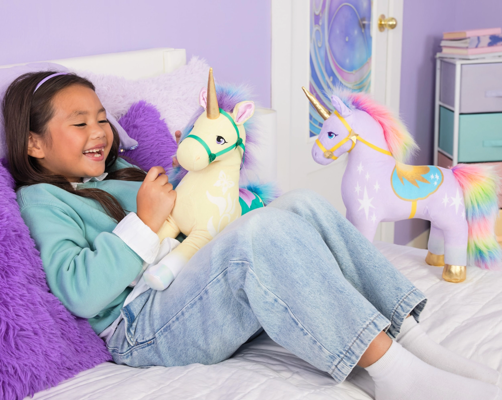 - Magični detajli: zlati rog, biserna kopita, intenzivno vijolične oči, satenasta notranjost ušes.