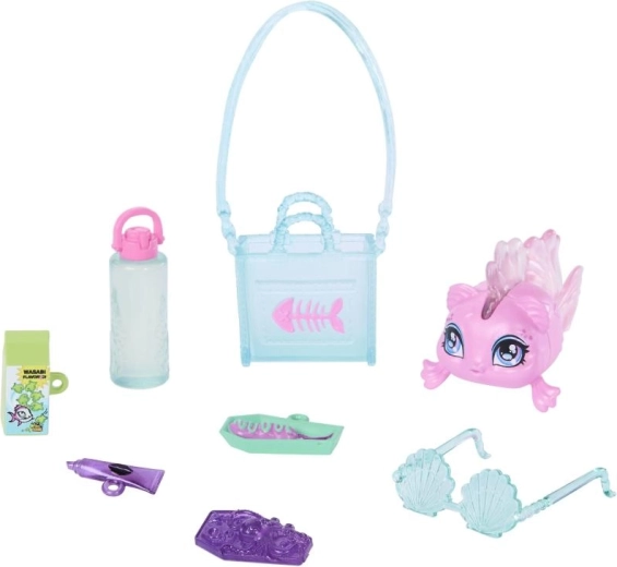 V paketu najdete prikupno ribico Neptuno ter komplet dodatkov, kot so torbica, očala, prigrizek, pijača in »telefon« za ustvarjalno igro.