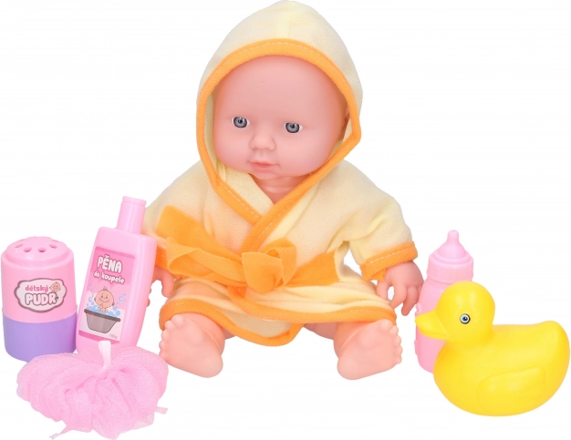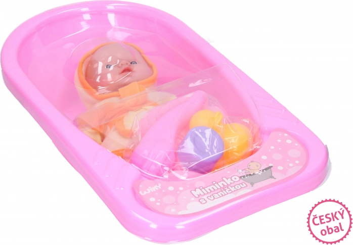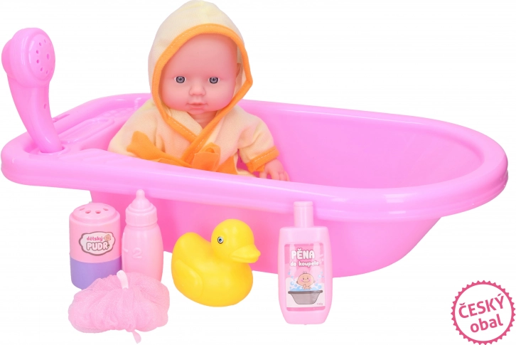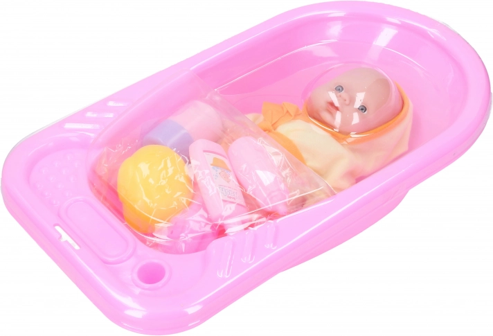 Set dojenček z banjico je idealen za majhne negovalke. Set vsebuje dojenčka velikosti 24 cm in banjico dolgo 40 cm, kar je popolno za zabavno kopanje.
