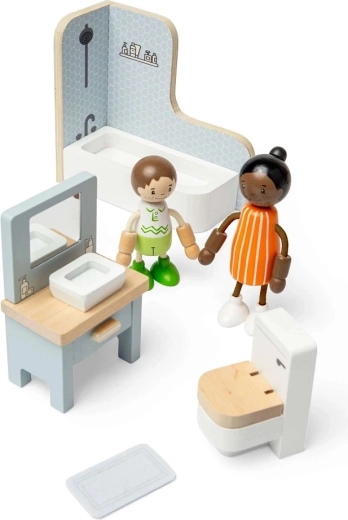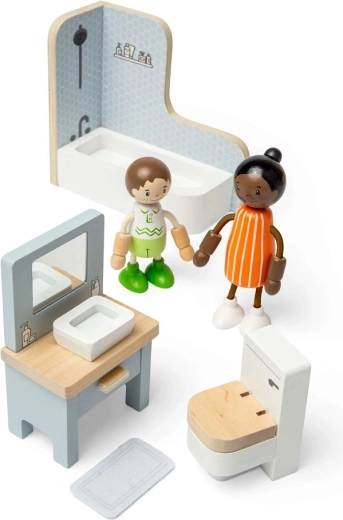 Stilski lesen kopalniški komplet za hiško za punčke prinaša vse potrebno za vsakodnevne rituale – kad s prho, umivalnik z ogledalom, stranišče in kopalno preprogo. Zahvaljujoč kakovostnemu FSC® lesu je trpežen, varen in prijazen do narave. Spodbuja domišljijo, igre vlog ter razvoj socialnih veščin pri otrocih od 3. leta dalje.