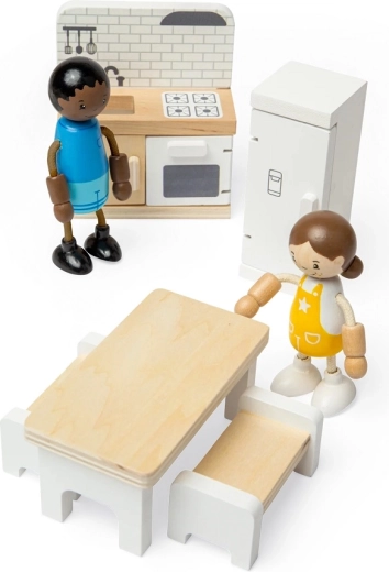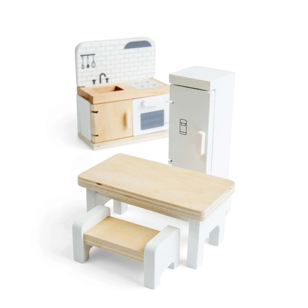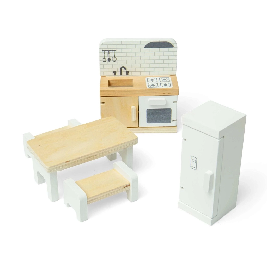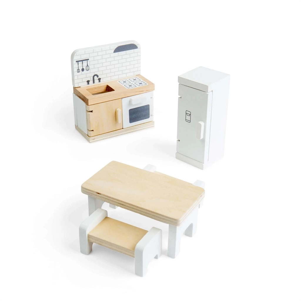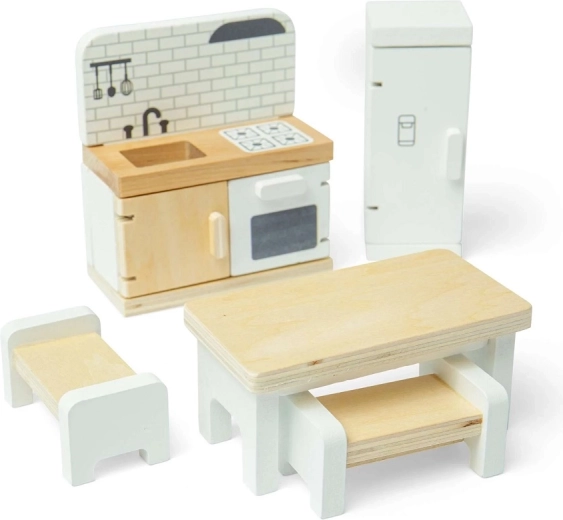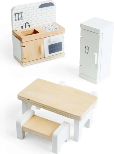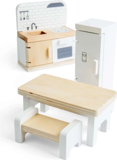 Spremenite hiško za punčke v prijetno kuhinjo s to kakovostno garnituro znamke Bigjigs Toys. Set vključuje hladilnik, kuhinjski pult z umivalnikom, štedilnikom in pečico, jedilno mizo ter 2 klopi za realistično igranje vlog. Gladka lesena izvedba z FSC certifikatom je trpežna, varna in prijazna do narave. Spodbuja ustvarjalnost, fino motoriko in skupinsko igro otrok od 3. leta dalje.
