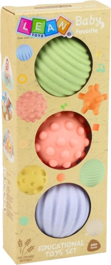 Set treh mehkih senzoričnih žogic za dojenčke od prvih mesecev podpira razvoj fine motorike in čutnega zaznavanja. Vsaka žogica ima drugačno teksturo z različnimi žlebovi in izboklinami, ki spodbujajo tip, vzpodbujajo k prijemanju, stiskanju in kotaljenju ter so hkrati varne in prijetne na dotik. Nežne pastelne barve ne preveč stimulirajo in vabijo k igri doma, v posteljici ali na igralni podlogi.